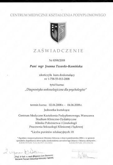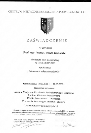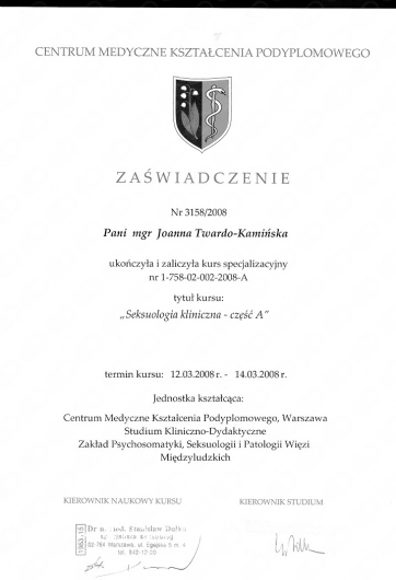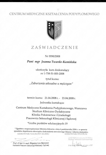 Przez ponad 10 lat współpracowałam z największą Poradnią Seksuologiczną w Polsce, która znajduje się w Warszawie przy ulicy Dolnej 42. Pracowałam również w Poradni Nerwic przy Szpitalu Nowowiejskim.
