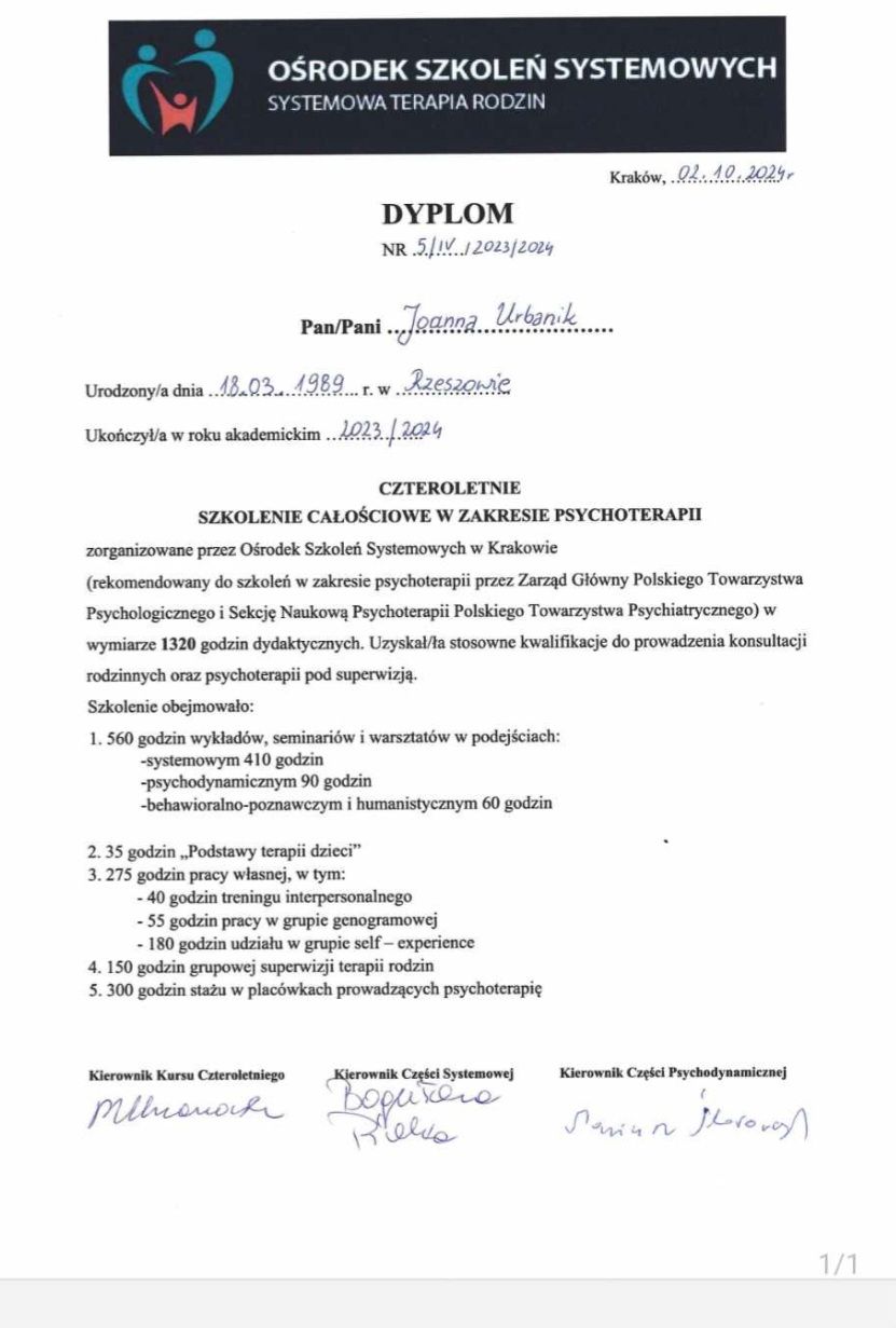 Jestem dyplomowanym psychoterapeutą. Ukończyłam 4-letnie, całościowe szkolenie psychoterapeutyczne, które jest akredytowane przez Polskie Towarzystwo Psychologiczne i Polskie Towarzystwo Psychiatryczne.