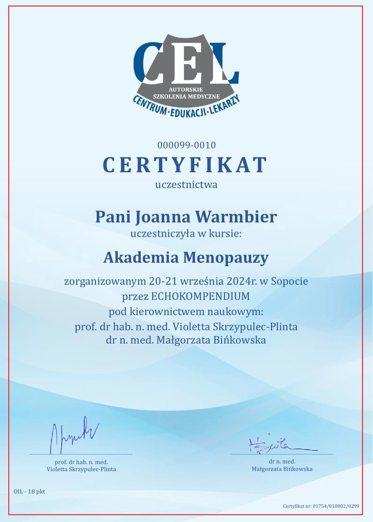 Specjalizację ukończyłam w roku 2014 uzyskując tytuł lekarza specjalisty w zakresie ginekologii i położnictwa.
