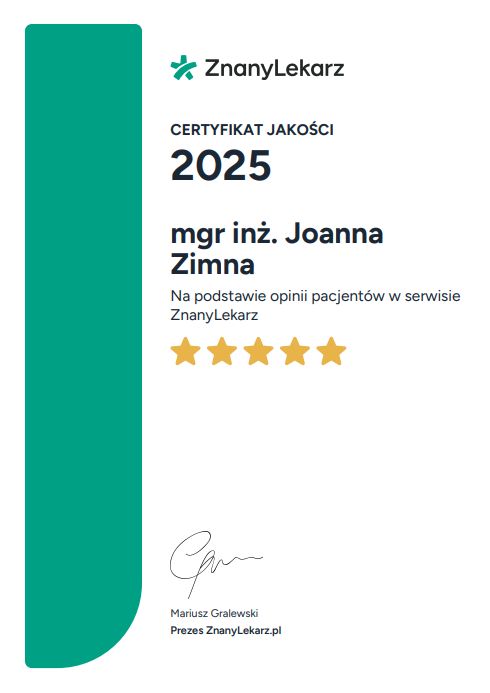 Czy Joanna Zimna przyjmuje online, bez konieczności pojawiania się w placówce?Tak, Joanna Zimna oferuje konsultacje online. Wybierz opcję „konsultacja online” przy umawianiu wizyty, a zobaczysz dostępne terminy.
