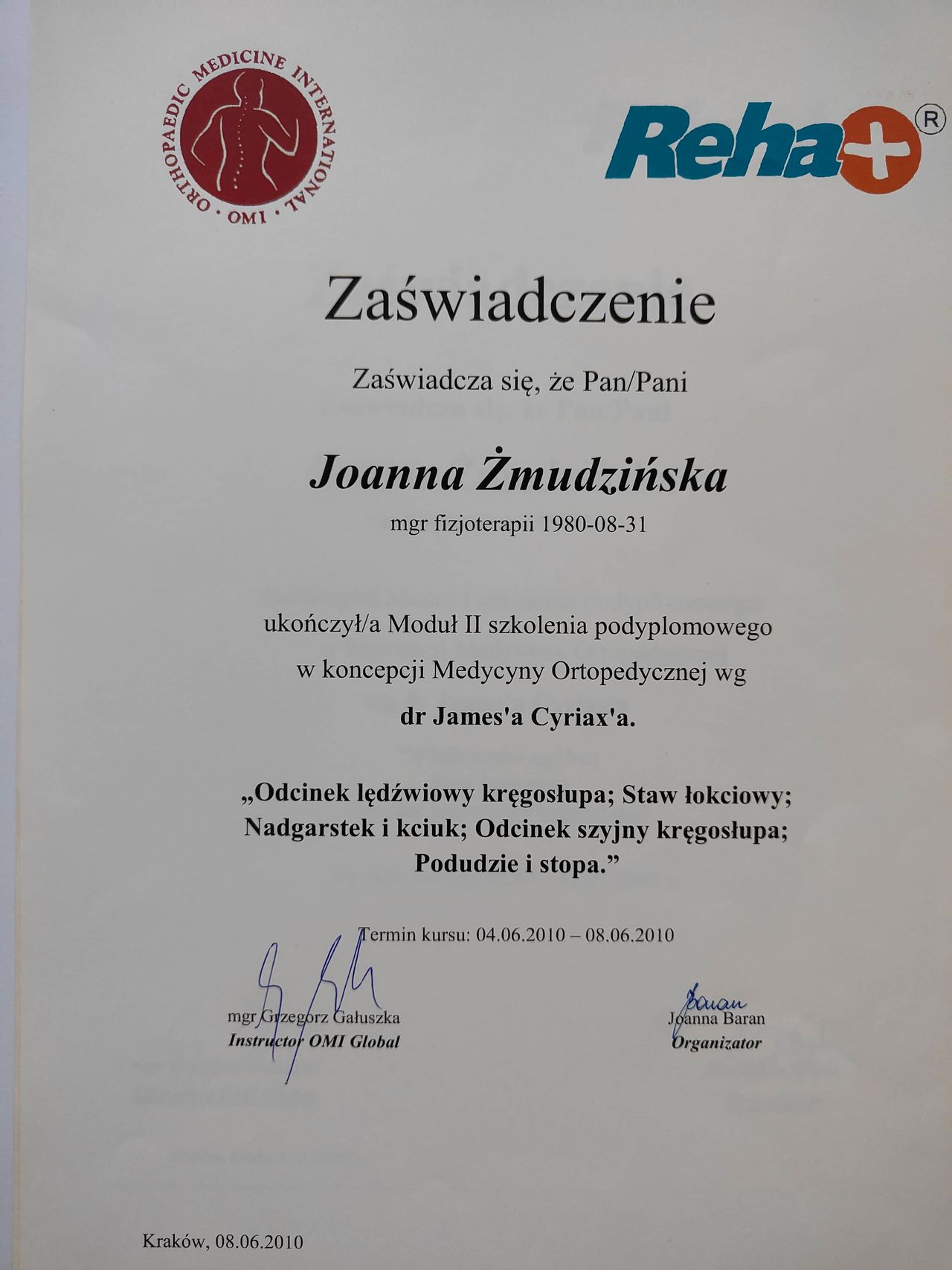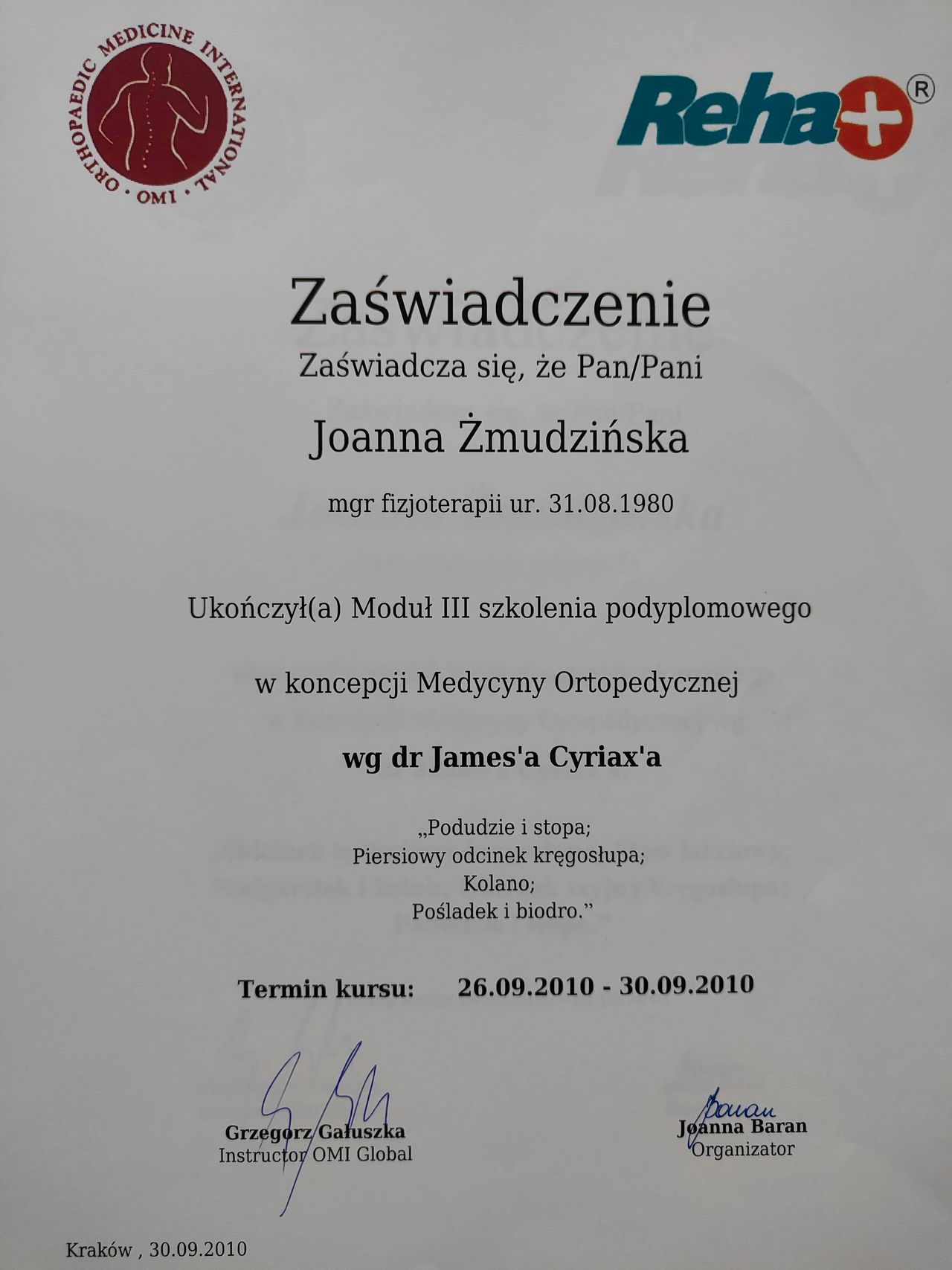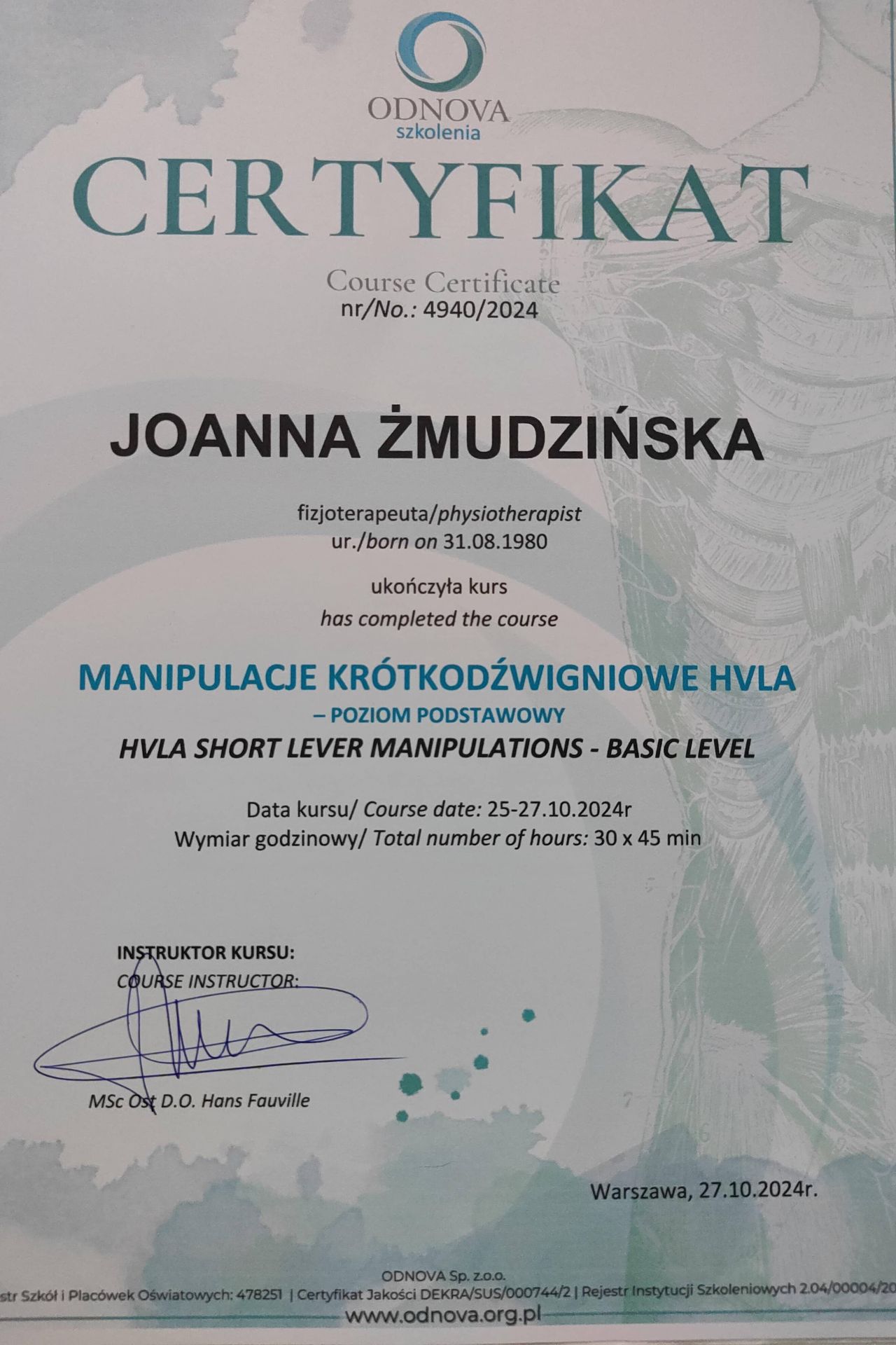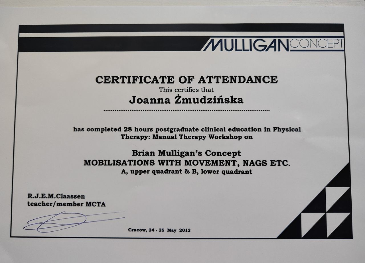 Obecnie jestem na 3 roku studiów podyplomowych z Osteopatii w Still Academy of Osteopathy w Warszawie.