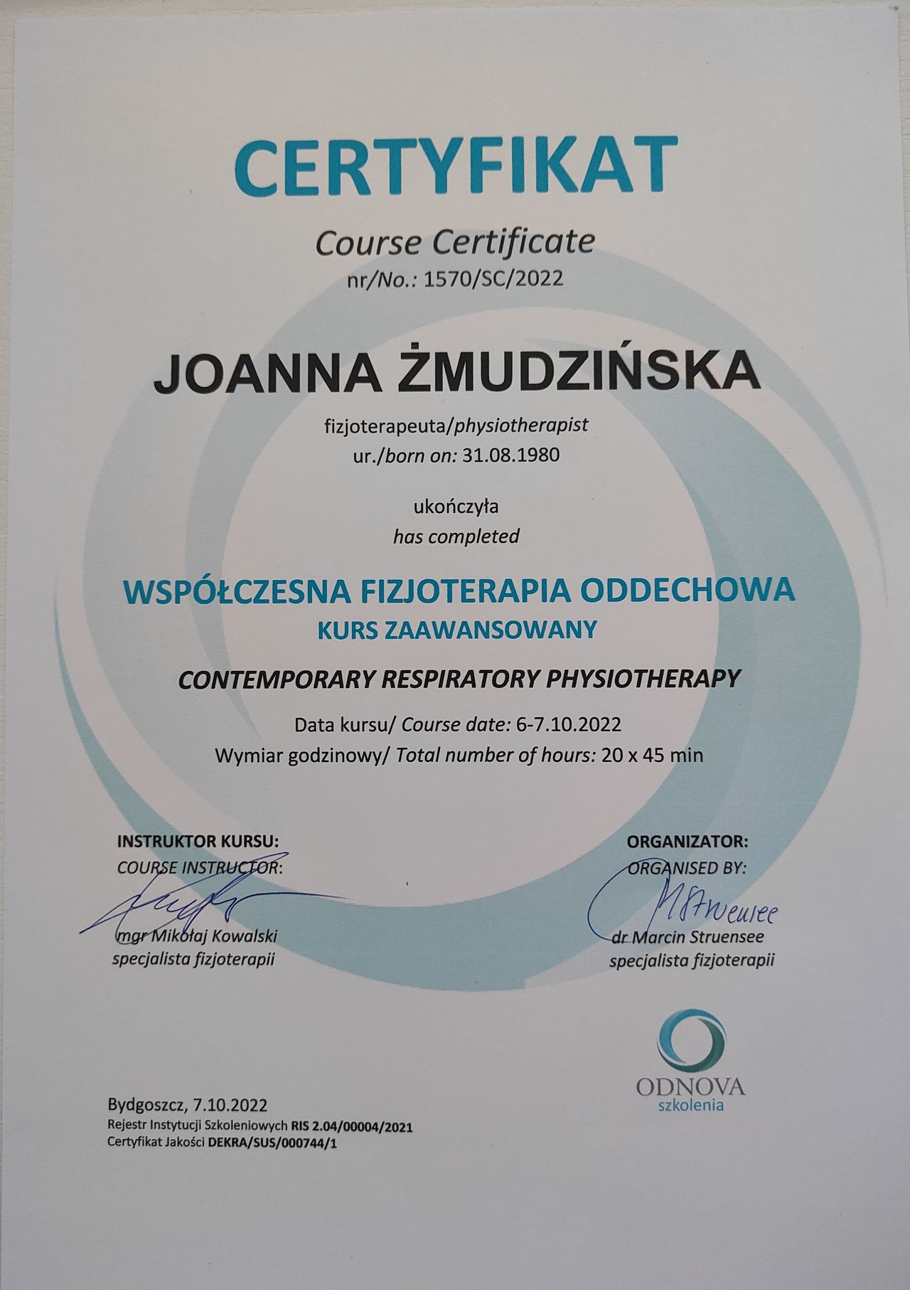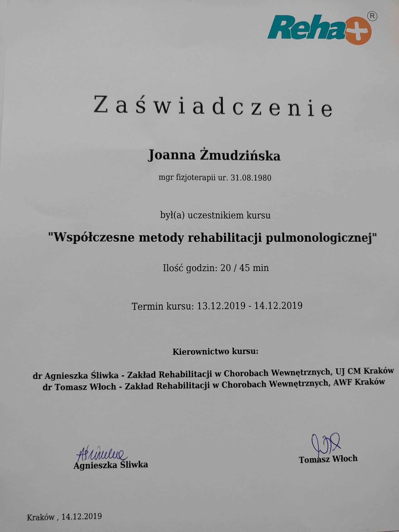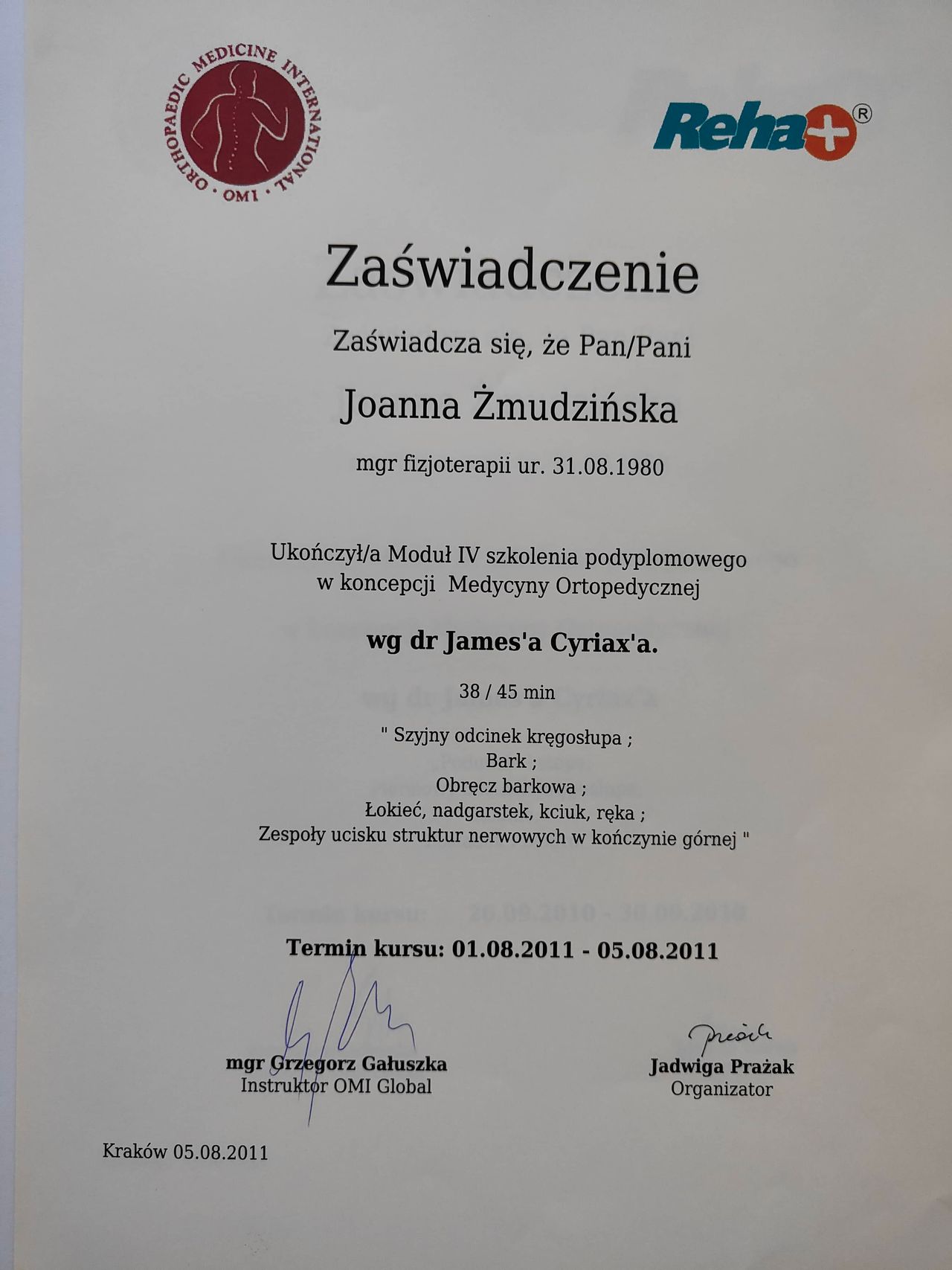 Obecnie jestem na 3 roku studiów podyplomowych z Osteopatii w Still Academy of Osteopathy w Warszawie.