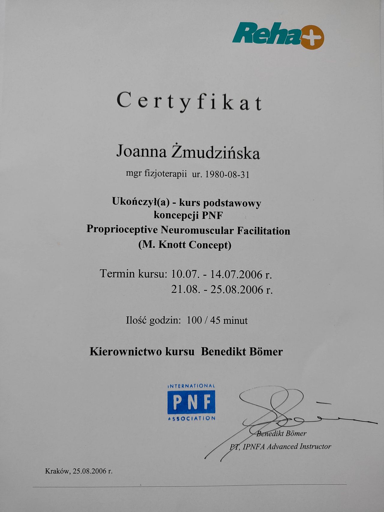 Fizjoterapią zajmuje się od 2005 roku. Ukończyłam m.in. kursy: