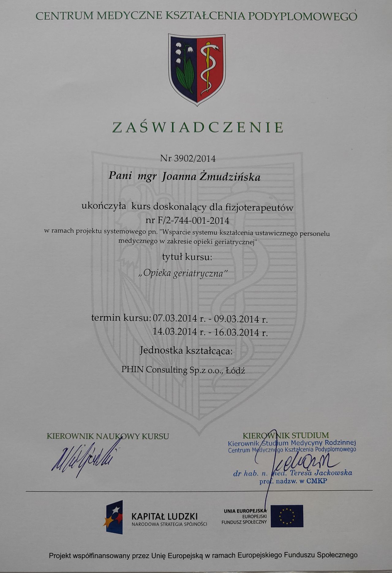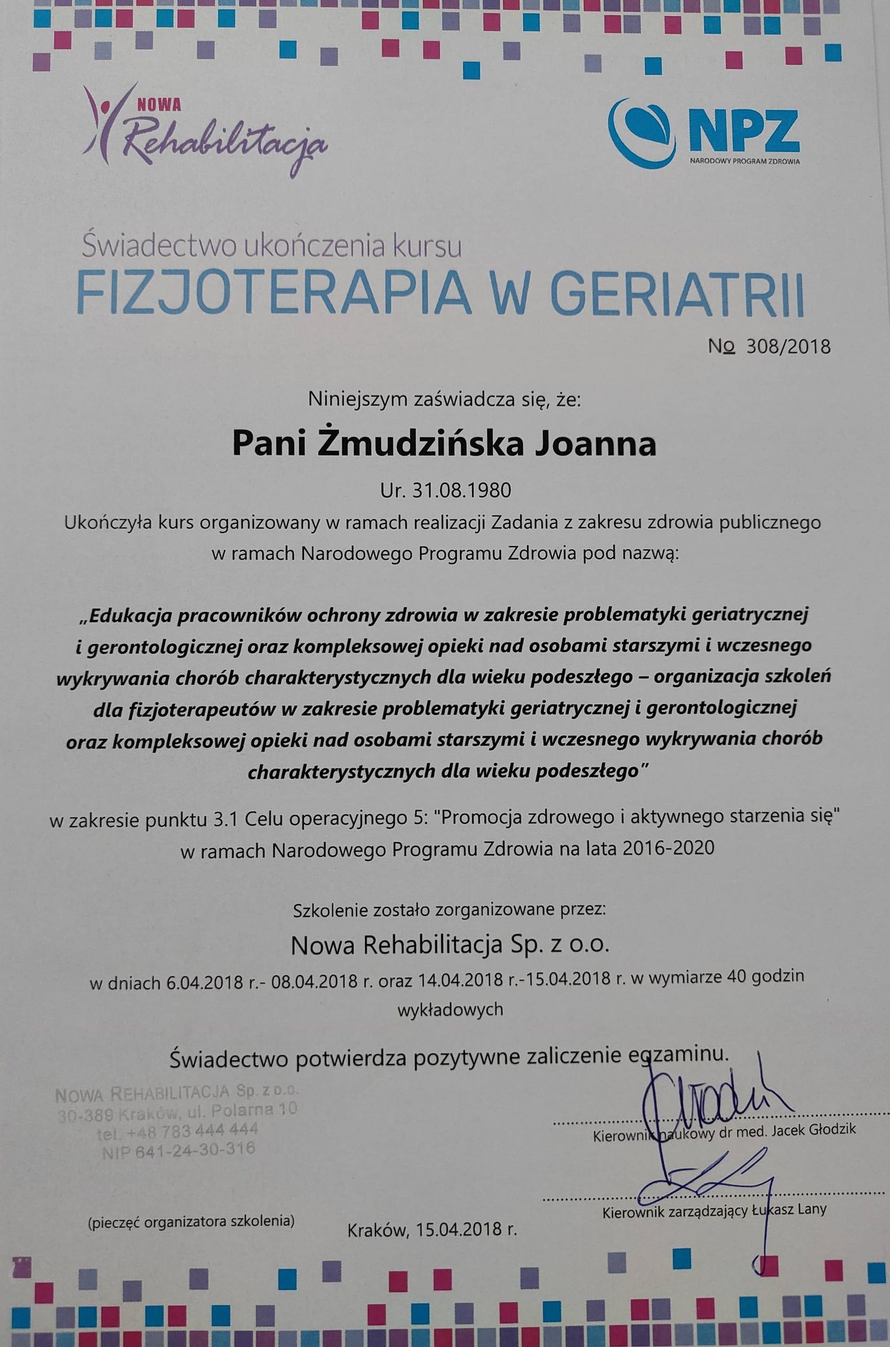 Ukończyłam studia magisterskie na Wydziale Fizjoterapii Uniwersytetu Medycznego w Łodzi. W 2016 roku ukończyłam studia podyplomowe z Geriatrii i opieki długoterminowej na Uniwersytecie Jagiellońskim w Krakowie.
