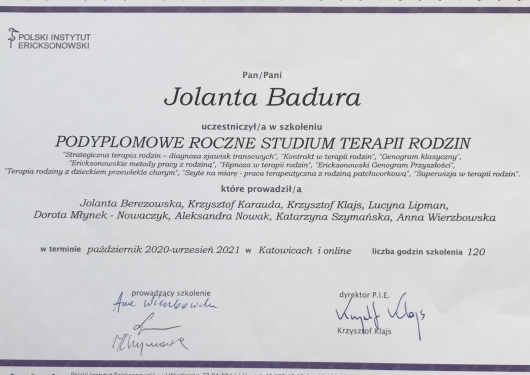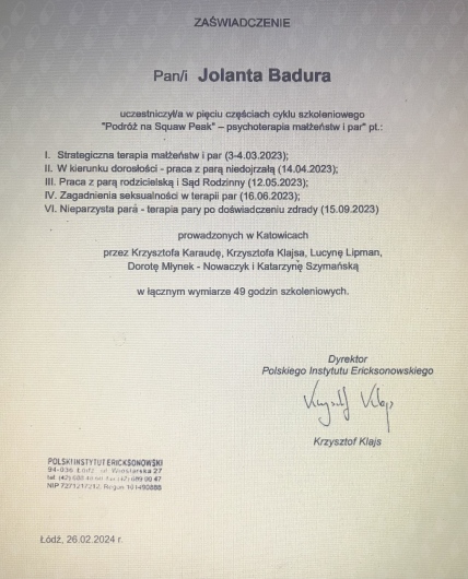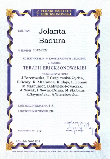 Swoje kompetencje stałe podnoszę, uczestnicząc w 2.5 letnim szkoleniu I stopnia psychodramy wg. Moreno w Polskim Instytucie Psychodramy w Krakowie.