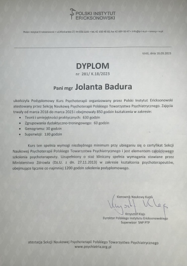 Spotkania z Panią Jolantą są bardzo wartościowe i niosą za sobą wielką naukę. Odpowiedni sposób prowadzenia terapii i nadanie kierunków potwierdza i wzmacnia jej sens i motywuje do dalszej pracy nad sobą.