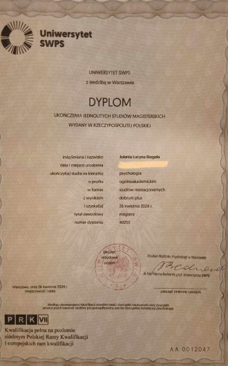 Z zawodu oraz - przede wszystkim - pasji jestem psychologiem i pedagogiem. Ukończyłam psychologię na Uniwersytecie SWPS oraz szkolenie na terapeutę uzależnień w Centrum Aktywnego Rozwoju i Edukacji – Szkoła Terapeutów Uzależnień Brok. Pracuję z osobami dorosłymi oraz młodzieżą od 13 r.ż. Od zawsze towarzyszy mi potrzeba niesienia pomocy, zrozumienia i wsparcia drugiemu człowiekowi. Priorytetem w mojej pracy jest zapewnienie pacjentowi poczucia bezpieczeństwa, komfortu i szacunku do niego i podejmowanych przez niego decyzji. W trakcie spotkań przestrzegam zasad etycznych. Ponadto wieloletnie doświadczenie w pracy z młodzieżą pozwala mi na lepsze zrozumienie również trudności, z którymi borykają się nastolatkowie.