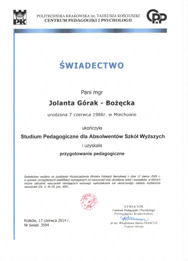 Czy Jolanta Górak-Bożęcka przyjmuje online, bez konieczności pojawiania się w placówce?Tak, Jolanta Górak-Bożęcka oferuje konsultacje online. Wybierz opcję „konsultacja online” przy umawianiu wizyty, a zobaczysz dostępne terminy.