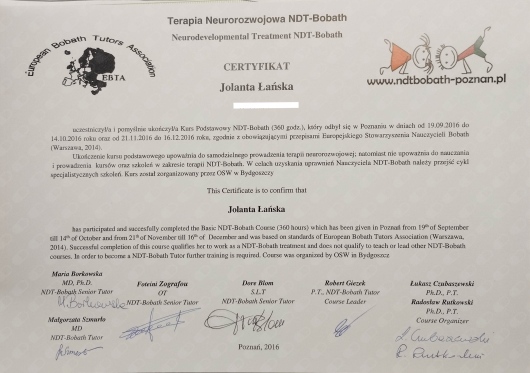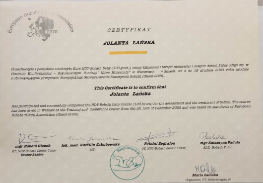 Ukończyłam liczne kursy specjalistyczne, które pomagają mi trafnie stawiać diagnozę potrzeb moich pacjentów oraz dobierać odpowiednią formę terapii. Kursy, które ukończyłam to m.in. NDT Bobath, NDT Bobath Baby, MEDEK, PNF, Terapia tkanek miękkich w pediatrii, Zastosowanie technik powięziowych w pediatrii, Leczenie Autonomicznego Układu Nerwowego.