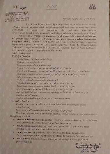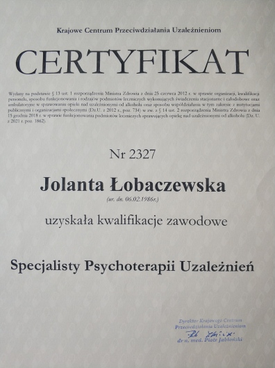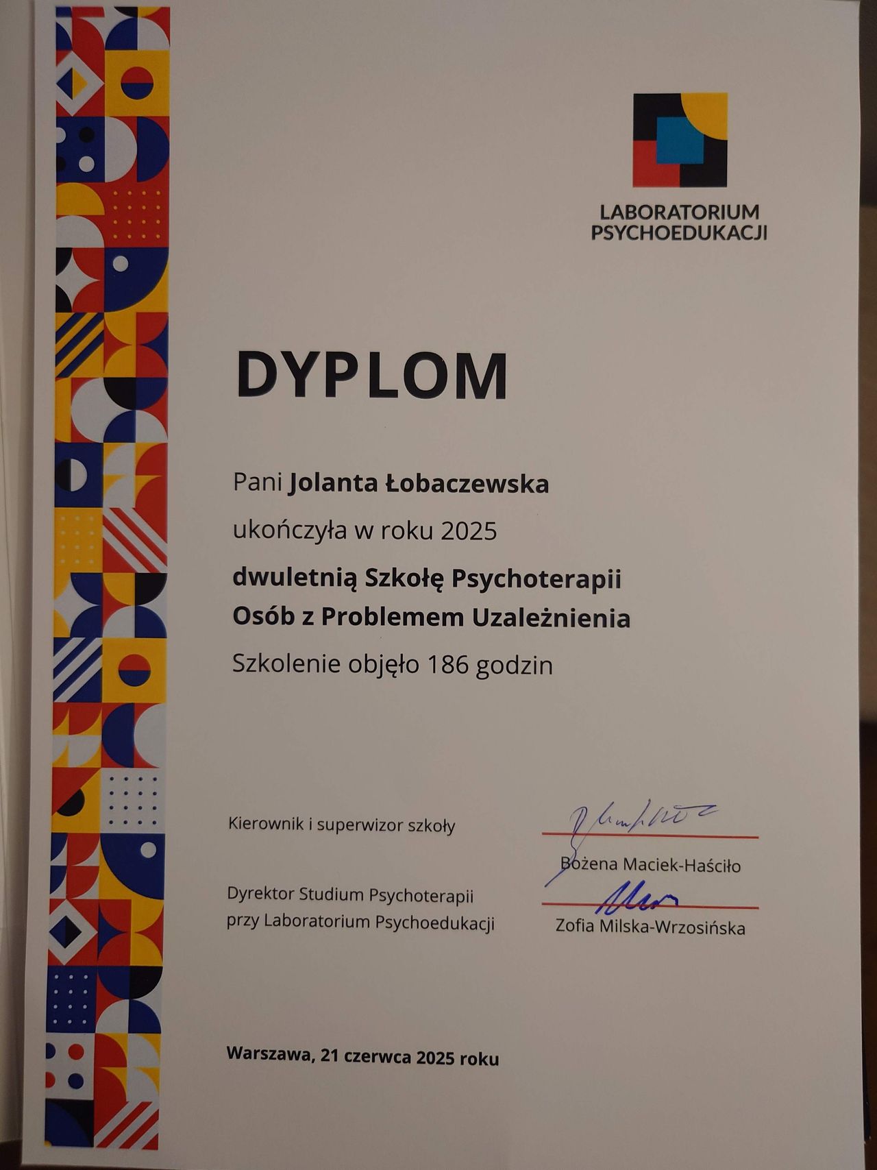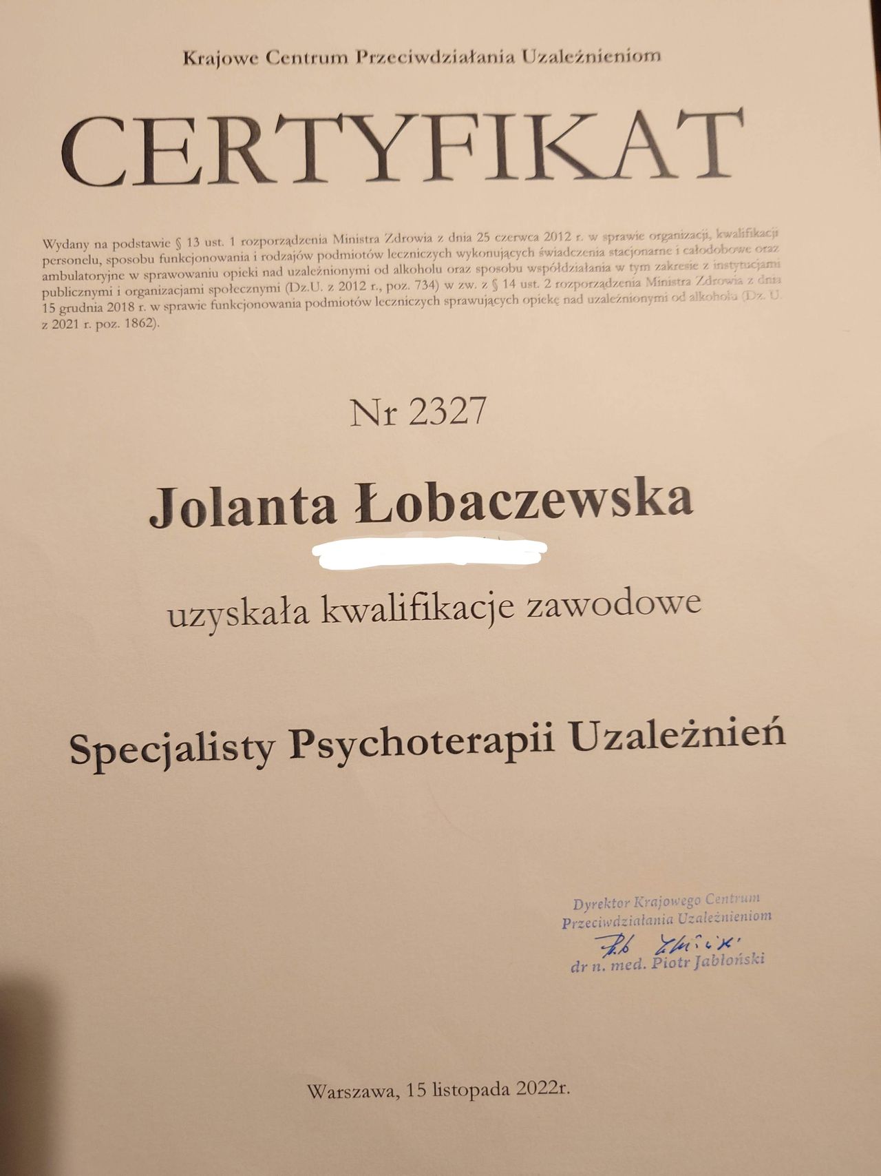 Pierwsza moja terapia w życiu. Mimo obaw poszedłem, otworzyłem się i jestem bardzo zadowolony. Terapię zakończyłem jako człowiek o wyższym komforcie życia, bardziej pewny siebie i znający swoją wartość. Do tego uporałem się z nałogiem jaki mi doskwierał. Jestem niezmiernie zadowolony. Pani Jolanta bardzo sympatyczna, miła i ciepła osoba potrafi wyciągnąć z człowieka to co najlepsze i naprowadzić na właściwe tory.