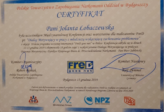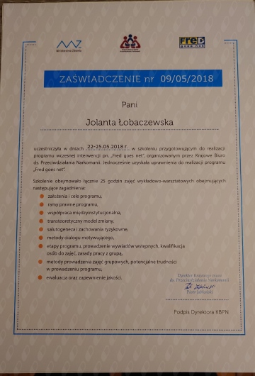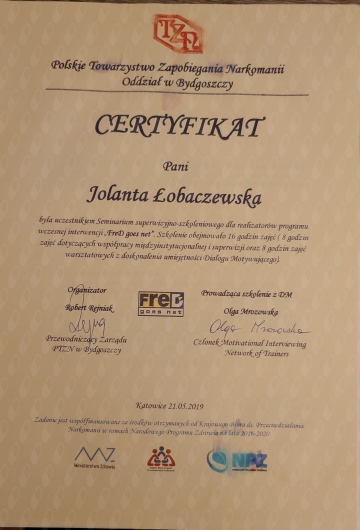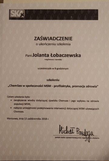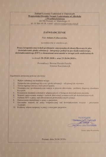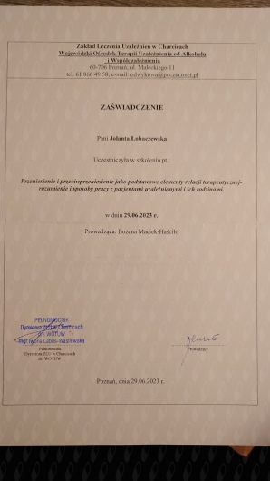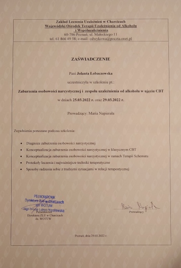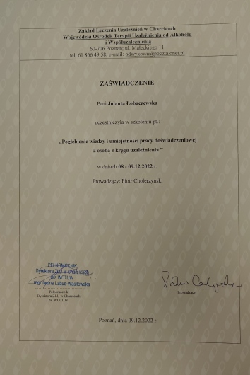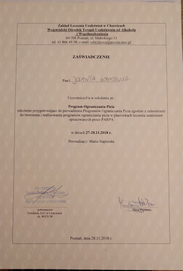Pracuję głównie z: • Osobami mającymi problem z uzależnieniem od substancji psychoaktywnych, używających substancji szkodliwie jak i ryzykownie, • Osobami przejawiającymi trudności z uzależnieniami behawioralnymi (hazard, seks, gry), • Osobami, które mają trudności w relacjach z osobą uzależnioną, • Młodzieżą przejawiającą zachowania ryzykowne, oraz młodzieżą eksperymentującą z substancjami psychoaktywnymi (powyżej 16 r. ż.) • Osobami przejawiającymi trudności relacyjne. Pracuję w podejściu redukcji szkód i narzędziem dialogu motywującego. Bez względu na wybór celu terapii czy będzie to abstynencja, czy kontrolowanie używania substancji liczy się dla mnie przede wszystkim poprawa jakości życia pacjenta. Każda osoba jest traktowana indywidualnie, wspólnie ustalamy program i cel terapii skupiając się na potrzebach pacjenta, biorąc pod uwagę różnorodność doświadczeń ludzkich. W pracy z drugim człowiekiem ważne jest dla mnie stworzenie relacji terapeutycznej w oparciu o szacunek i bezpieczeństwo. Towarzyszę pacjentom w ich trudnościach i cierpieniu z troską i empatycznym wsparciem. Wierzę, że każdy posiada zdolności i zasoby do samorozwoju, swoim wsparciem i motywacją próbuję je wzmocnić. Próbuję widzieć świat, takim, jaki widzi go pacjent i mu w nim towarzyszyć. Jestem absolwentką kierunku pedagogika resocjalizacyjna z kryminologią na Uniwersytecie Adama Mickiewicza, oraz Szkoły dla Specjalistów Psychoterapii i Instruktorów Terapii Uzależnień Care w Broku, a także kierunku ze specjalizacją Hospitality Business Management na Uniwersytecie Sheffield Hallam w Wielkiej Brytanii. Odbyłam wiele szkoleń poprzez Wojewódzki Ośrodek Terapii Uzależnień i Współuzależnień w Poznaniu, między innymi technika pracy narzędziem EMDR (Eye Movement Desentization and Reprocessing) jak i technika pracy wokół problemów emocjonalnych metodą w podejściu EFT (Emotional Focused Therapy). Ukończyłam także szkolenie terapeutyczne dla osób mających problem z pornografią i kompulsywną seksualnością, oraz zjawiskiem chemsexu w społeczności MSM. Jestem certyfikowanym realizatorem Programu Ograniczania Picia, oraz certyfikowanym realizatorem programów profilaktyki uniwersalnej „Unplugged” oraz profilaktyki wskazującej „Fred goes Net” dla młodzieży. Na codzień pracuję w Wojewódzkim Ośrodku Terapii Uzależnień i Współuzależnień w Poznaniu. Swoją pracę superwizuję w superwizji prywatnej, superwizji w szkole, oraz superwizji w ośrodku. Ukończyłam2-letnie szkolenie przy Laboratorium Psychoedukacji "Szkoła Psychoterapii Osób z Problemem Uzależnienia", dodatkowo uczestniczę w seminariach przy Laboratorium Psychoedukacji w Warszawie.