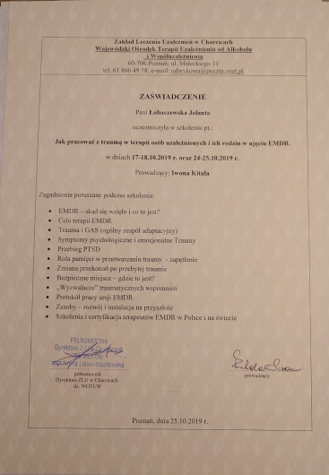 Terapia przynosi rezultaty :) Pani Jolanta jest skuteczna, empatyczna a spotkania z nią sklaniaja do przemyśleń ktore wspomina się w chwilach zawachania. Zdecydowanie polecam :)