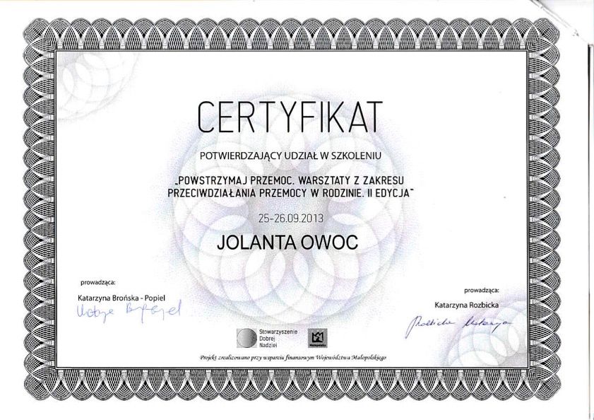 Kieruje się Kodeksem Etycznym Psychologa. Moja praca podlega superwizjom. Nieustannie podnoszę swoje kwalifikację poprzez uczestnictwo w specjalistycznych kursach i szkoleniach.