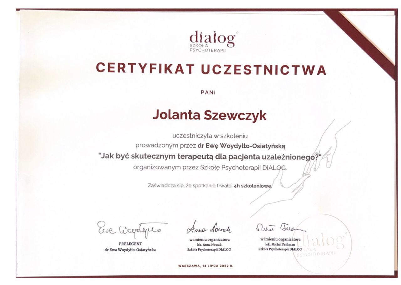 Chciałbym wyrazić swoją ogromną wdzięczność za pomoc, jaką otrzymałem od mojego psychoterapeuty uzależnień. Jego podejście jest niezwykle profesjonalne, ale jednocześnie pełne empatii i zrozumienia. Każda sesja daje mi poczucie bezpieczeństwa, co pozwoliło mi otworzyć się i zacząć pracować nad swoimi problemami. Dzięki wsparciu Pani Joli zrozumiałem, że uzależnienie to nie tylko kwestia woli, ale głębsze mechanizmy, które wymagają kompleksowego podejścia. Metody Pani Joli są skuteczne, a atmosfera w gabinecie sprzyjała mojemu rozwojowi i zmianom. Jestem naprawdę wdzięczny za pomoc i polecam tego terapeutę każdemu, kto zmaga się z podobnymi problemami.