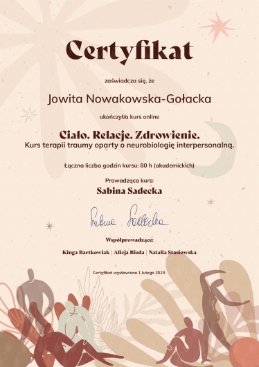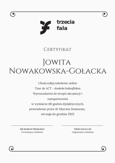Pani Jowita to wspaniała specjalistka, pełna empatii i zrozumienia. Uważna, zawsze profesjonalna, z ogromem wiedzy, pamiętająca każdy szczegół, potrafiąca wprowadzić swobodną atmosferę. Jej ciepłe podejście i profesjonalizm sprawiły, że łatwo było mi zaufać i opowiedzieć o tym co najbardziej bolesne. Już od pierwszego spotkania czułam się wysłuchana i zaopiekowana. Dzięki naszym sesjom nie tylko nauczyłam się lepiej radzić sobie z emocjami, ale też zyskałam nowe perspektywy na wiele spraw. Z pomocą pani Jowity udało mi się poukładać wszystkie trudne kwestie. Gorąco polecam każdemu, kto szuka wsparcia w trudnych momentach! To terapia, która zmienia życie. Dziękuję z całego serca!