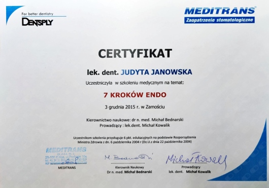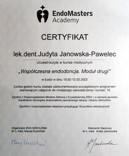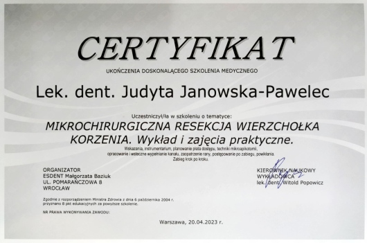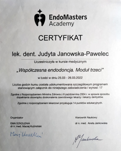 Nieustannie podnoszę swoje kwalifikacje zawodowe, uczestnicząc w kursach i warsztatach oferowanych przez czołowe ośrodki szkoleniowe, takie jak Dental Master Group czy Witkowscy Dental Training Center. Dzięki temu mam dostęp do najnowszych technik i rozwiązań w dziedzinie endodoncji mikroskopowej oraz odbudów pod mikroskopem, co przekłada się na wysoką jakość świadczonych usług.