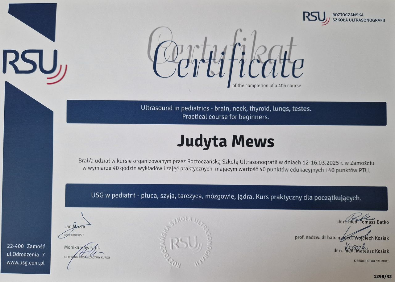 Jaki jest zakres porad oferowanych przez Judyta Mews?Judyta Mews to pediatra, ultrasonografista, alergolog. Na podstawie swojego doświadczenia i wykształcenia Judyta Mews oferuje usługi takie jak: konsultacja pediatryczna, USG układu moczowego dzieci, USG jąder - dzieci, USG tkanek miękkich dzieci, USG tarczycy dzieci, USG ślinianek dzieci, USG ocena refluksu żołądkowo - przełykowego dzieci, konsultacja pediatryczna + USG, konsultacja pediatryczna (weekend), USG Płuc u dzieci.