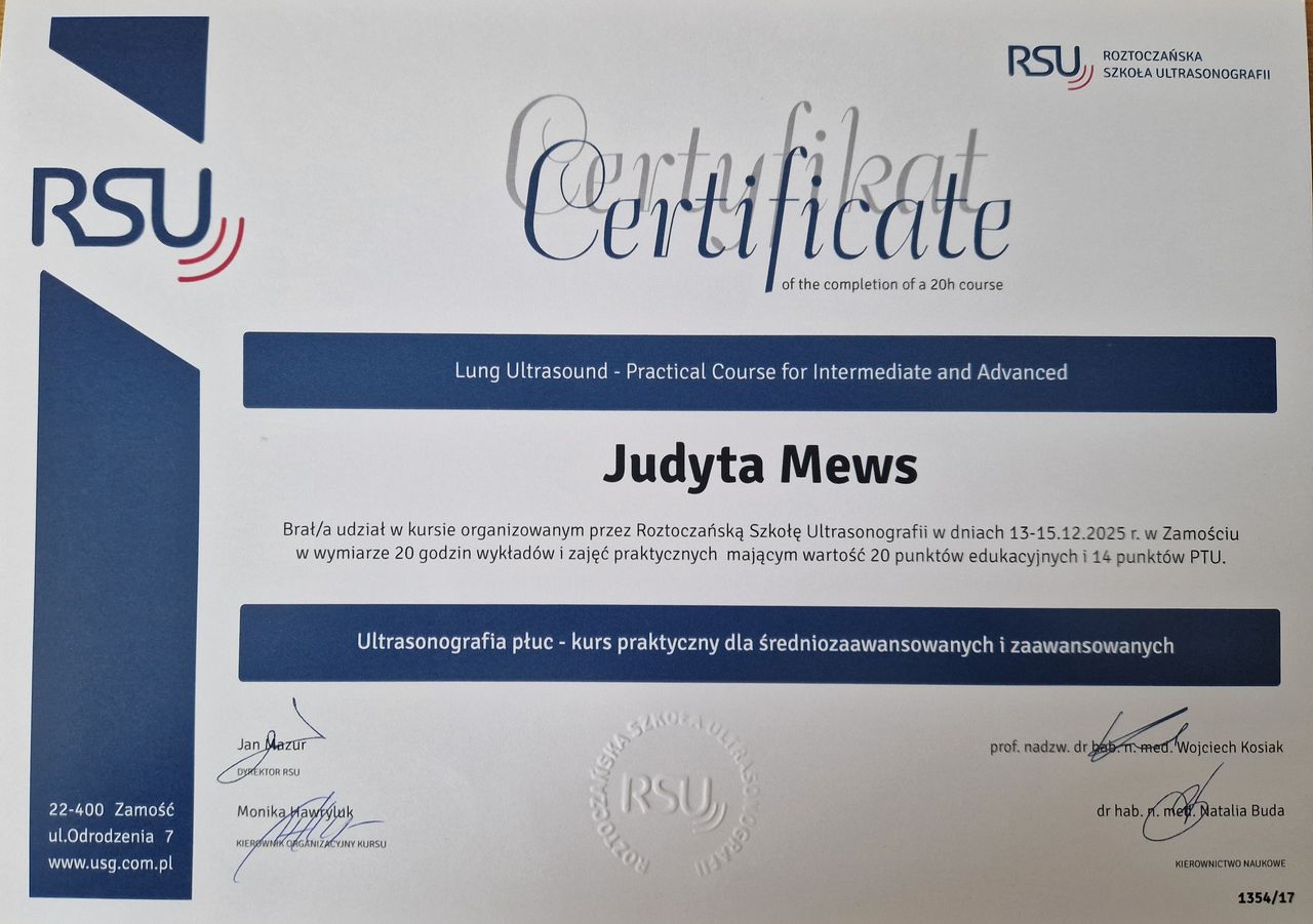 Nieustannie poszerzam swoją wiedzę, biorąc udział w licznych szkoleniach i kongresach poświęconych pediatrii, alergiom wziewnym i pokarmowym, alergicznym chorobom skóry, immunoterapii oraz diagnostyce ultrasonograficznej.
