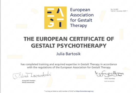 Odbyłam całościowe 4-letnie szkolenie z zakresu psychoterapii w Instytucie Integralnej Psychoterapii Gestalt w Krakowie akredytowane przez European Association for Gestalt therapy (EAGT) i Polskie Towarzystwo Psychologiczne (PTP). Ukończyłam także 2 letnią Zaawansowaną Szkołę Współczesnej Psychoterapii Psychodynamicznej realizowaną przez Laboratorium Psychoedukacji i Pracownię Humani we współpracy z Anna Freud Centre w Londynie. Posiadam certyfikat Europejskiego Towarzystwa Terapii Gestalt EAGT(24-3892). W swojej pracy psychoterapeutycznej integruję podejście humanistyczno-doświadczeniowe oraz psychodynamiczne. Aktualnie ciągle poszerzam swoją wiedzę oraz doskonalę umiejętności w obszarze terapii opartej na mentalizacji (MBT-Mentalization Baased Therapy), która bazuje na aktualnych badaniach z zakresu neuronauki oraz teorii przywiązania. Pracuje zgodnie z kodeksem etyki, a swoją pracę poddaję regularnej superwizji.