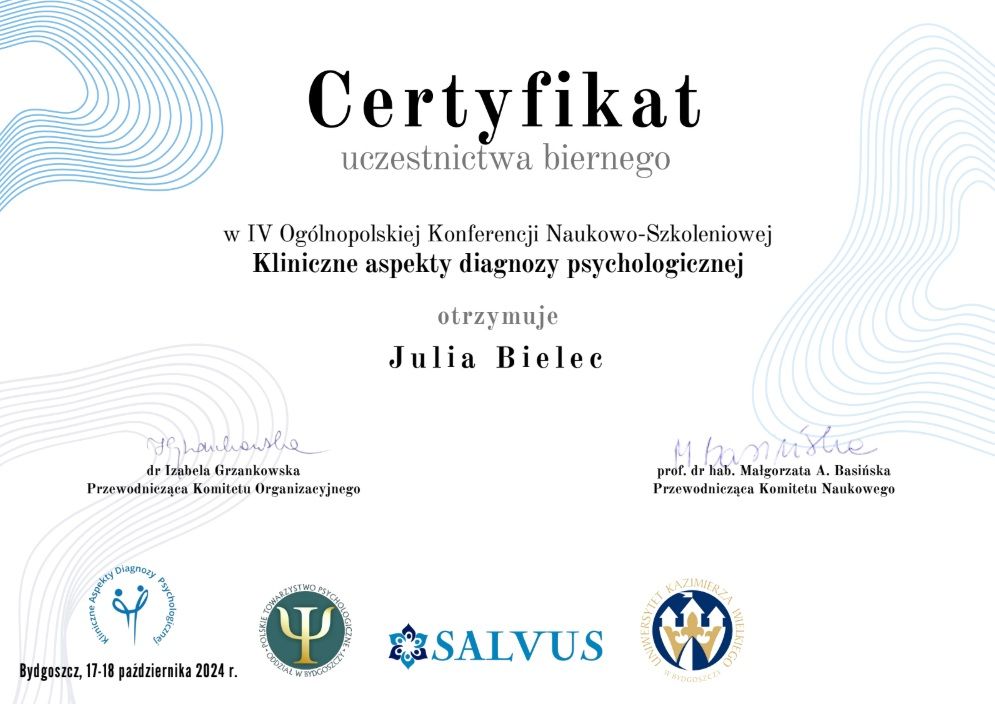 Z czystym sumieniem mogę polecić Panią Julię Bielec jako wyjątkowego specjalistę. Terapia u niej to była dla mnie prawdziwa podróż w głąb siebie. Dzięki jej wsparciu zrozumiałem mechanizmy, które powodowały napięcia w moich relacjach z rodziną. Pani doktor, dzięki swojej empatii i profesjonalizmowi, pomogła mi przejść przez ten trudny okres. Wyposażyła mnie w praktyczne narzędzia, takie jak techniki oddechowe i wizualizacje, które pozwalają mi zachować spokój nawet w najbardziej stresujących sytuacjach. Efektem terapii jest znacznie większa pewność siebie, umiejętność asertywnej komunikacji i głębsze zrozumienie siebie. Czuję, że jestem bardziej odporny na stres i potrafię budować zdrowsze relacje z innymi. Jeżeli szukasz wsparcia w pracy nad sobą, gorąco polecam Panią Julię.