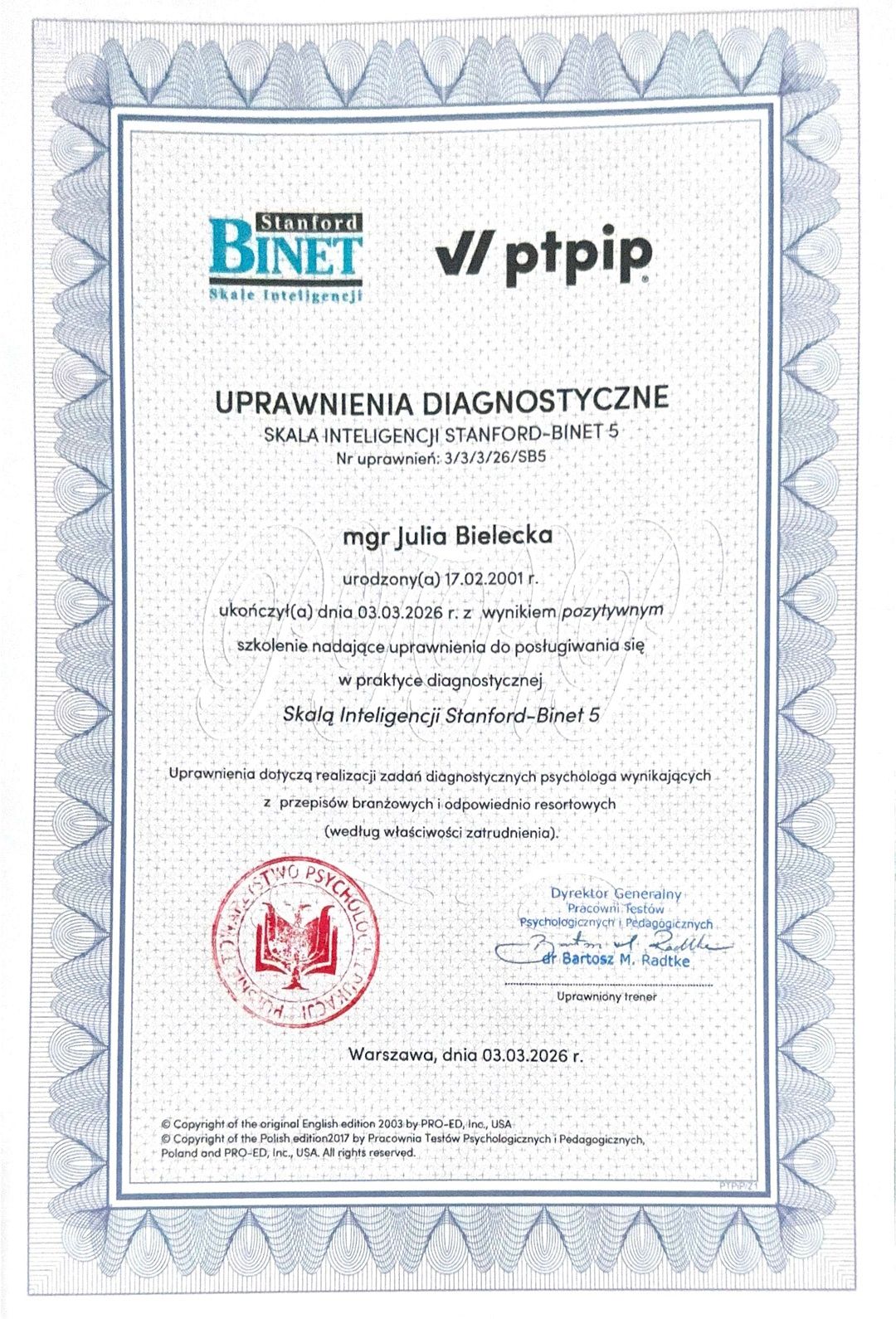 Posiadam uprawnienia do diagnozy poziomu rozwoju intelektualnego przy użyciu testu Stanford–Binet 5, który jest jednym z najbardziej rzetelnych narzędzi wykorzystywanych w diagnostyce psychologicznej.