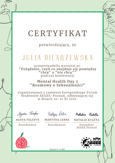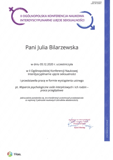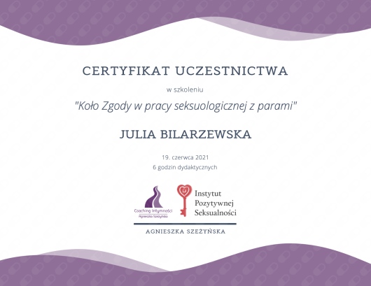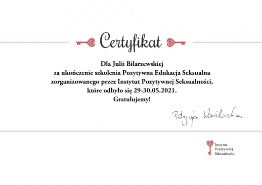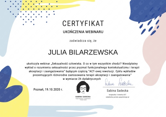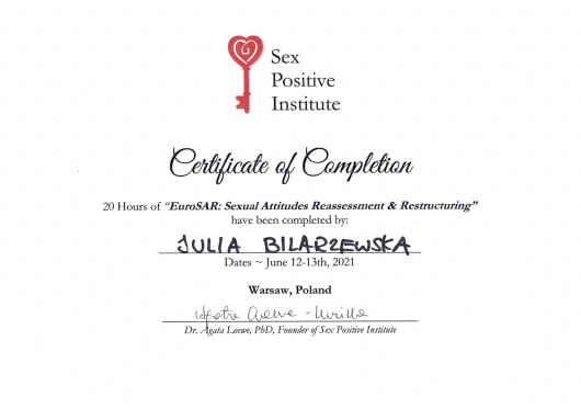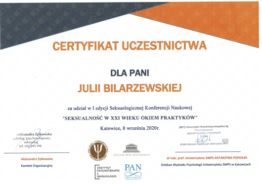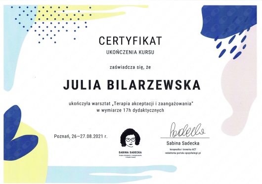 Pracuje z osobami dorosłymi w obszarze zdrowia psychicznego i seksualnego. Oferuje poradnictwo osobom doświadczającym kryzysów życiowych, trudności w obszarze emocji i relacji. Obecnie konsultacje odbywają się tylko online. Jestem psycholożką, seksuolożką i psychoterapeutką w trakcie szkolenia. Ukończyłam pięcioletnie studia magisterskie na Uniwersytecie SWPS w Poznaniu oraz podyplomowe studia z seksuologii. Jestem w trakcie czteroletniego szkolenia psychoterapeutycznego w szkole Behawioralnie, w której pogłębiam swoją wiedzę we współczesnych metodach terapii takich jak ACT, DBT, czy Terapii Schematów. Regularnie biorę udział w dodatkowych szkoleniach i konferencjach naukowych w obszarze psychologii i seksuologii. Zdrowie psychiczne i seksualne, postrzegam nie tylko jako brak objawów chorobowych, ale stan, który pozwala wieść nam takie życie jakiego chcemy, zgodne z naszymi wartościami i potrzebami. Dbam o to, aby wykorzystywane przeze mnie metody miały potwierdzenie w badaniach naukowych, korzystam z technik Terapii Akceptacji i Zaangażowania (ACT) oraz terapii systemowej. W swojej pracy kieruje się zasadami pozytywnej seksualności w sposób afirmujący różnorodność genderowo-relacyjną, w moim gabinecie jest miejsce dla wszystkich osób niezależnie od orientacji seksualnej, tożsamości płciowej, czy preferencji seksualnych. Specjalizuje się w pracy z: - trudnościom z uzyskaniem przyjemności seksualnej (bolesnym współżyciem, niskim libido, trudnościami z uzyskaniem podniecenia i orgazmu, problemami z utrzymaniem erekcji i/lub wytryskiem), - nietypowymi preferencjami seksualnymi, - trudnościami z rozumieniem i regulacją emocji, - trudnościami w budowanie bliskich relacji, - obniżonym nastrojem, - wsparciem i integracją kryzysów życiowych, - wyzwaniami w okresie okołoporodowym. Oprócz pracy indywidualnej organizuje liczne warsztaty z zakresu edukacji psychologicznej i seksualnej dla osób dorosłych i młodzieży. Swoją pracę poddaje regularnej superwizji. Zapraszam na konsultacje, w trakcie której szczegółowo omówimy możliwe rozwiązania i formy wsparcia. Julia Bilarzewska.