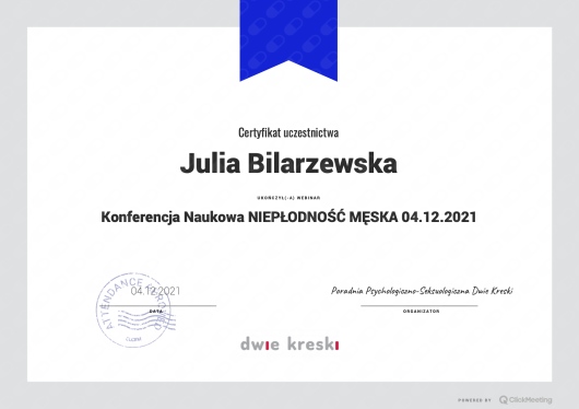 Czy Julia Bilarzewska przyjmuje online, bez konieczności pojawiania się w placówce?Tak, Julia Bilarzewska oferuje konsultacje online. Wybierz opcję „konsultacja online” przy umawianiu wizyty, a zobaczysz dostępne terminy.