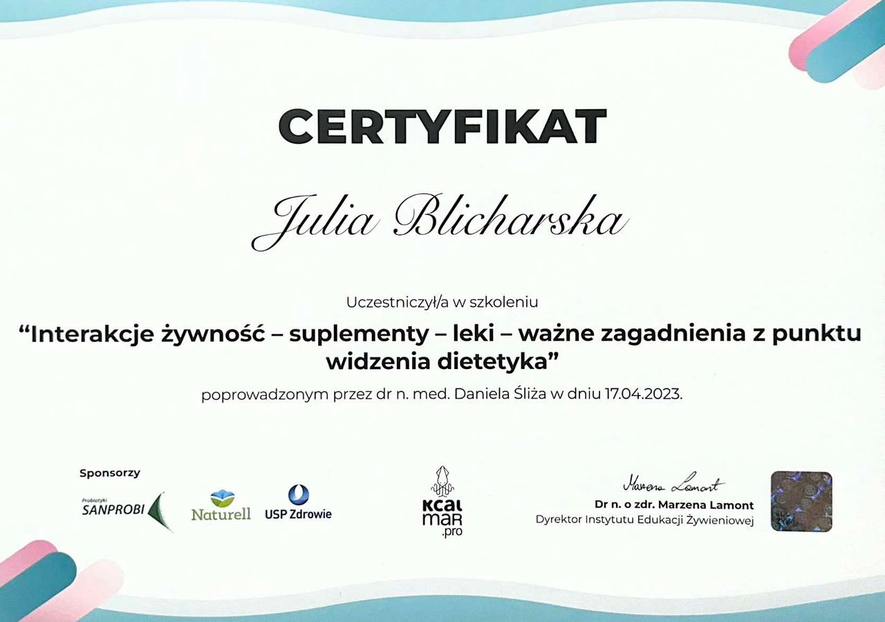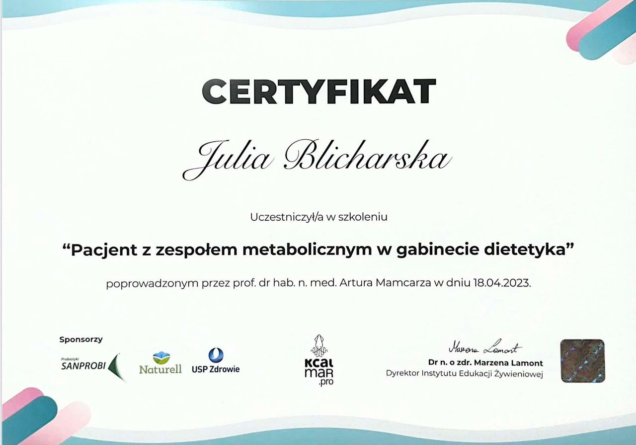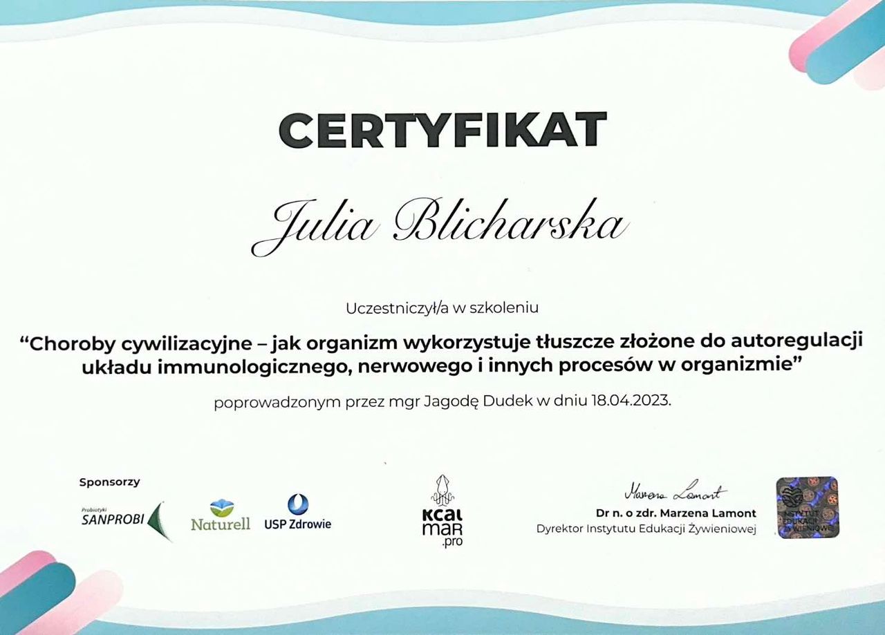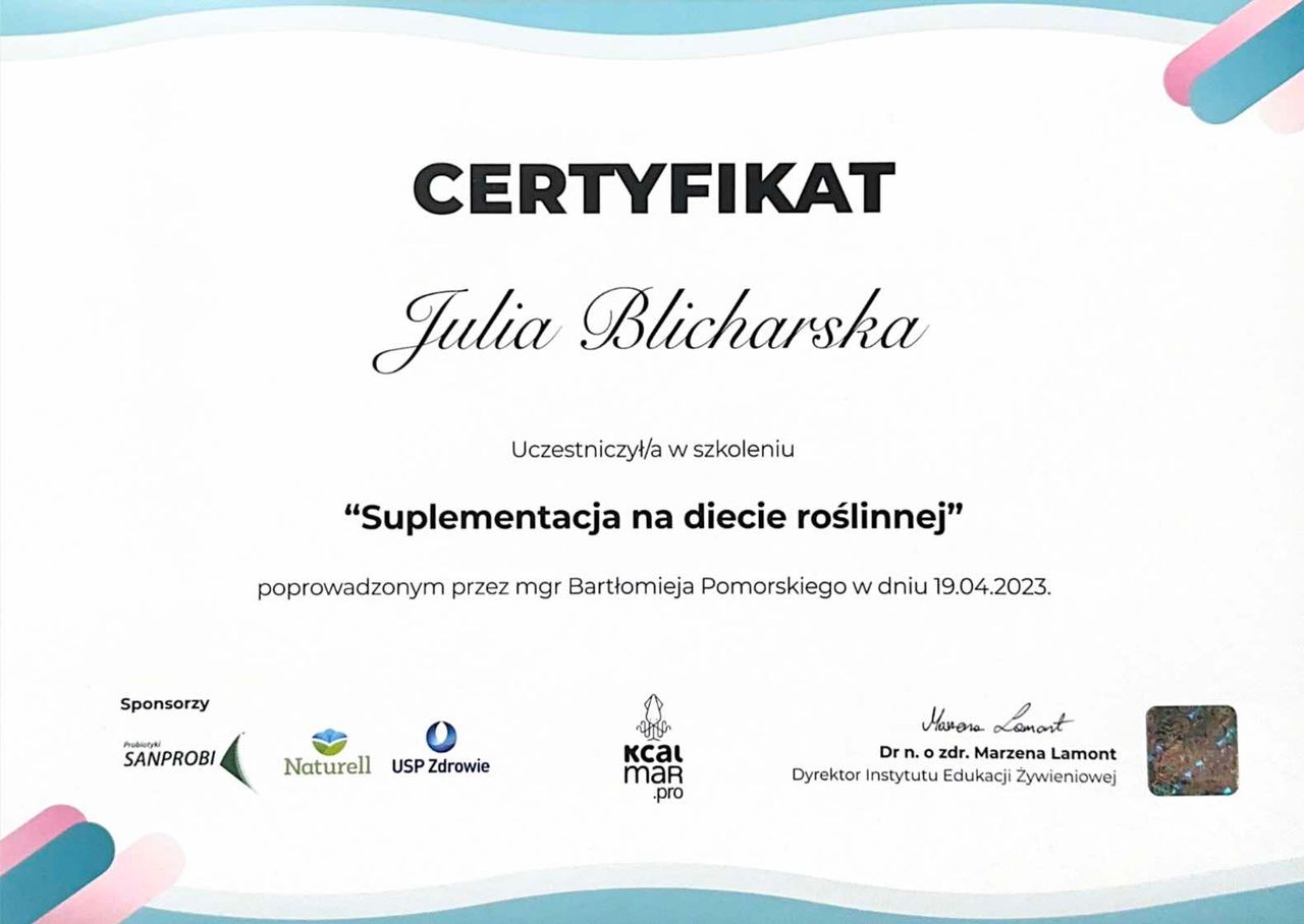 Jestem dyplomowanym dietetykiem z tytułem licencjata, specjalizującym się w psychodietetyce i zdrowym stylu życia. Obecnie kontynuuję naukę na studiach magisterskich z dietetyki oraz regularnie uczestniczę w szkoleniach i kursach, nieustannie poszerzając swoją wiedzę i kompetencje.