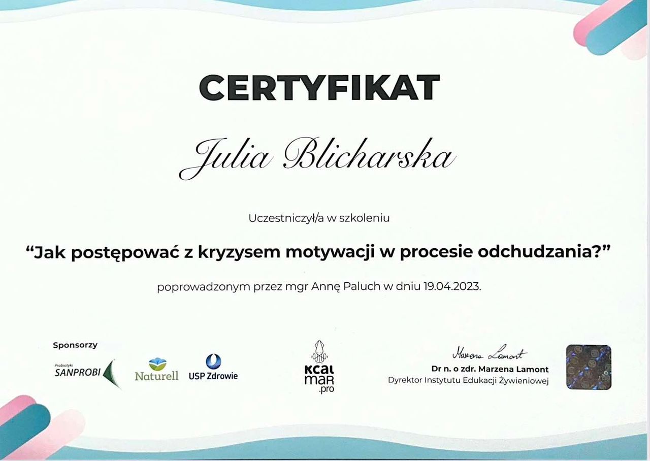 Pani Julia to bardzo kompetentna, wrażliwa i pełna pozytywnej energii osoba. Jestem bardzo zadowolona z konsultacji dietetycznej, na której dostałam bardzo dużo cennych wskazówek i poczułam się zrozumiana. Pani Julia potraktowała moje obawy i wątpliwości z pełnym szacunkiem i wyrozumiałości. Dzięki Pani Julii mam znowu motywację do działania! Polecam!