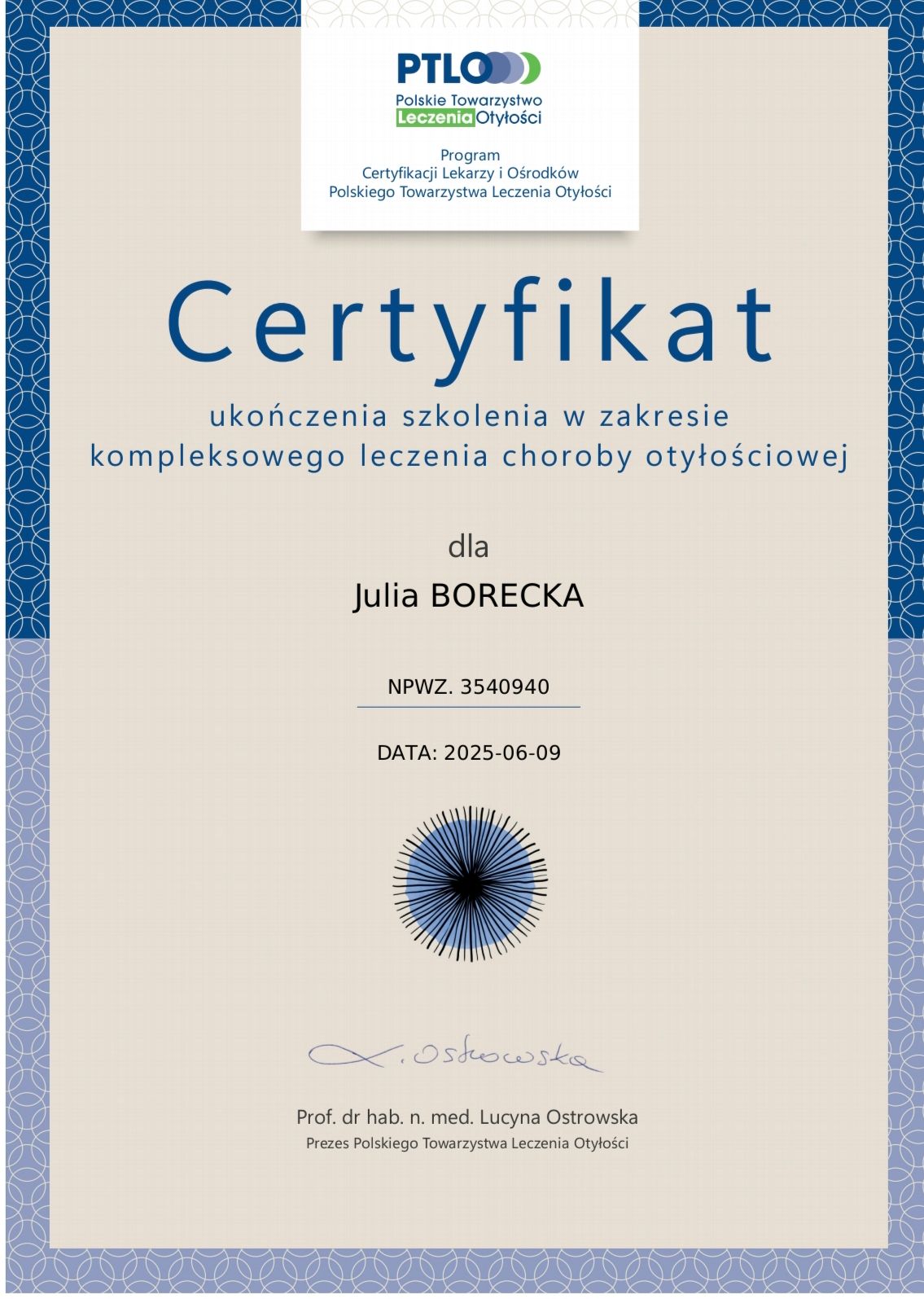 Jestem członkiem Polskiego Towarzystwa Medycyny Rodzinnej (PTMR) or Polskiego Towarzystwa Leczenia Otyłości (PTLO). Posiadam certyfikat I i II stopnia Polskiego Towarzysta Badań nad Otyloscia, ukonczylam kurs leczenia bólu, przewlekłej choroby nerek, szczepien ochronnych, oraz diabetologii dla POZ.