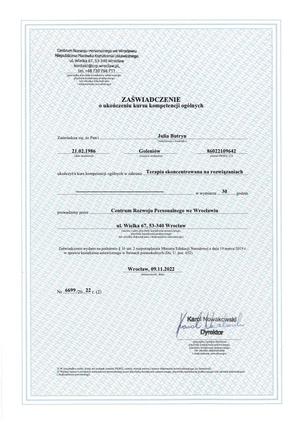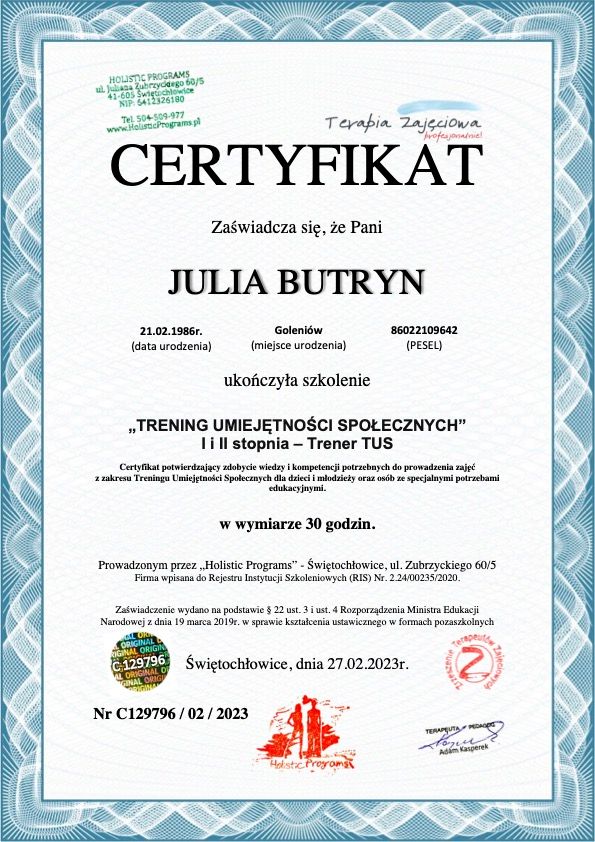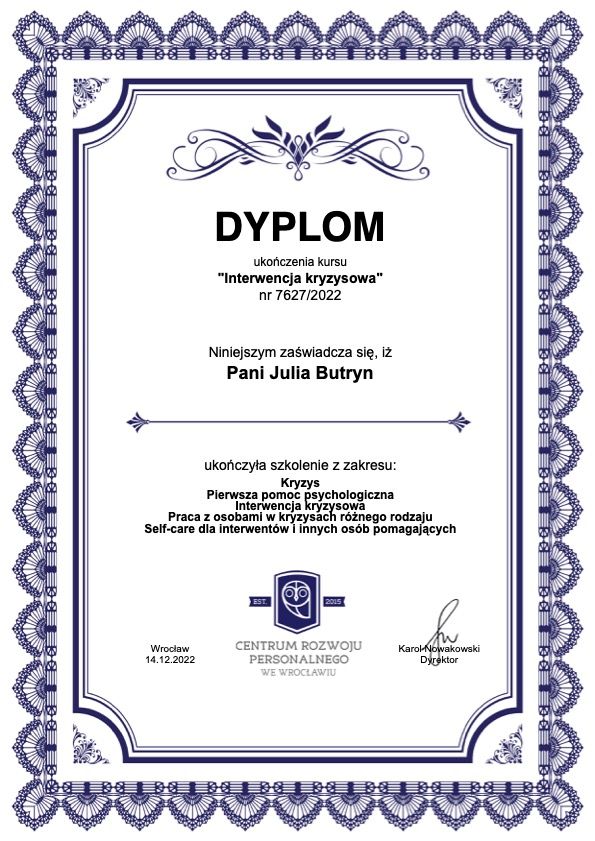 Stale rozwijam swoje kompetencje — ukończyłam m.in. kurs interwencji kryzysowej, szkolenia Trenera Treningu Umiejętności Społecznych (TUS) I i II stopnia oraz Terapii Skoncentrowanej na Rozwiązaniach (TSR).