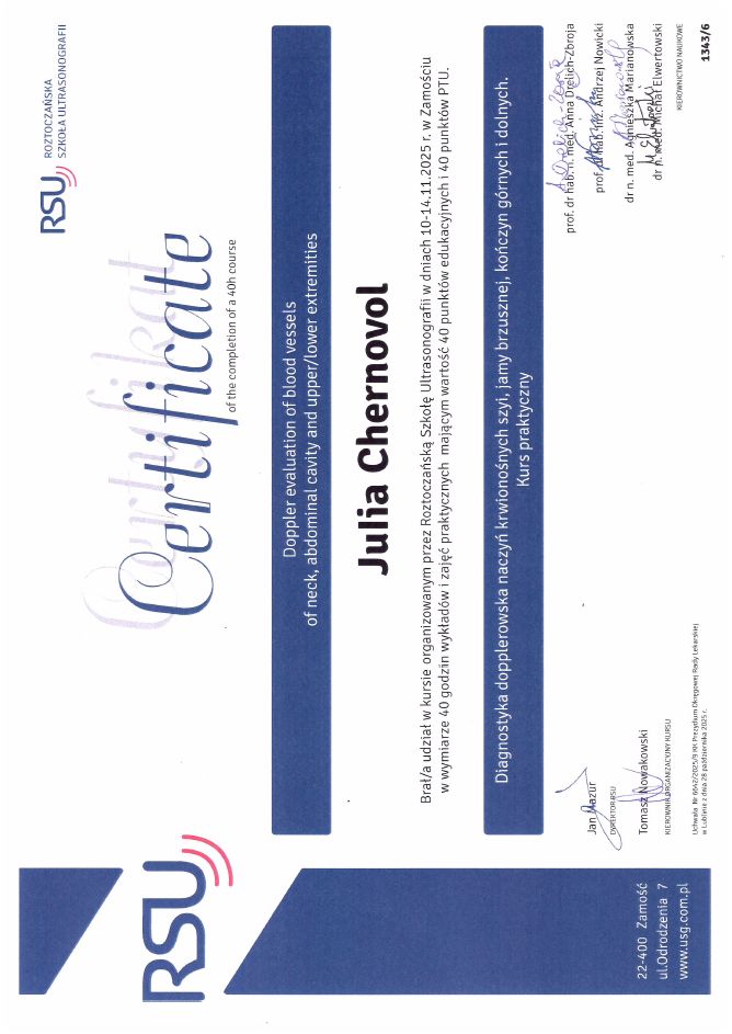Jaki jest zakres porad oferowanych przez Julia Chernovol?Julia Chernovol to w trakcie specjalizacji (angiolog). Na podstawie swojego doświadczenia i wykształcenia Julia Chernovol oferuje usługi takie jak: USG / doppler żył kończyn dolnych, USG doppler - diagnostyka żylaków kończyn dolnych, USG doppler - diagnostyka żylaków kończyn dolnych (dwie kończyny) + konsultacja, USG doppler kończyn dolnych - 2 nogi, USG doppler tętnic dogłowowych (tętnice szyjne i kręgowe), USG doppler żył kończyn dolnych (2 kończyny), USG Doppler żył lub tętnic (2 kończyny), USG dopplera żył kończyn dolnych z konsultacją flebologiczną, USG żył i tętnic kończyn (przepływy dopplerowskie), USG żył kończyn (przepływy dopplerowskie).