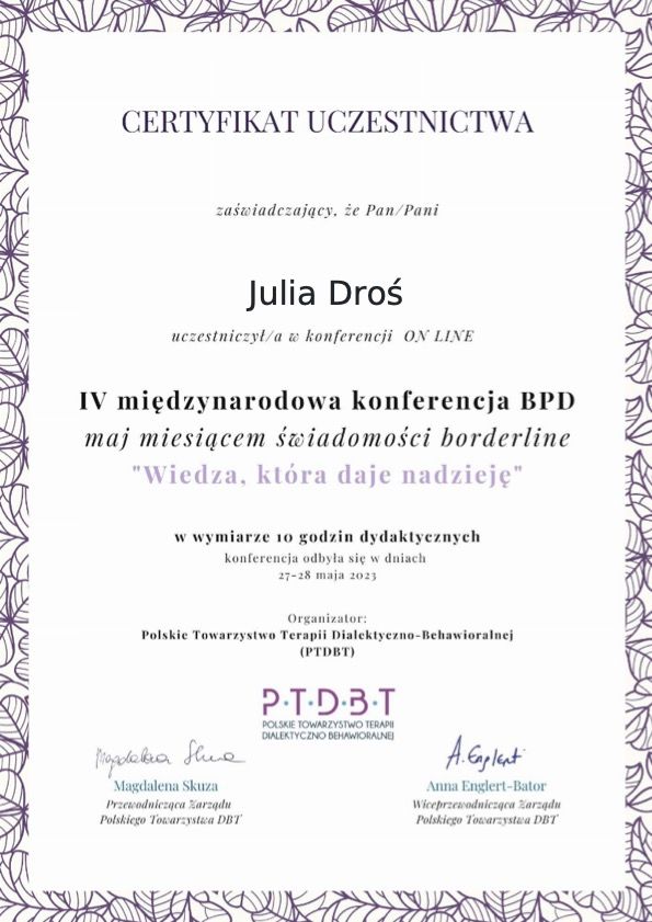 Uczęszczałam do Pani Julii na terapię przez prawie 1.5 roku i z perspektywy czasu nie wyobrażam sobie jak wyglądałoby moje życie bez wsparcia z jej strony.