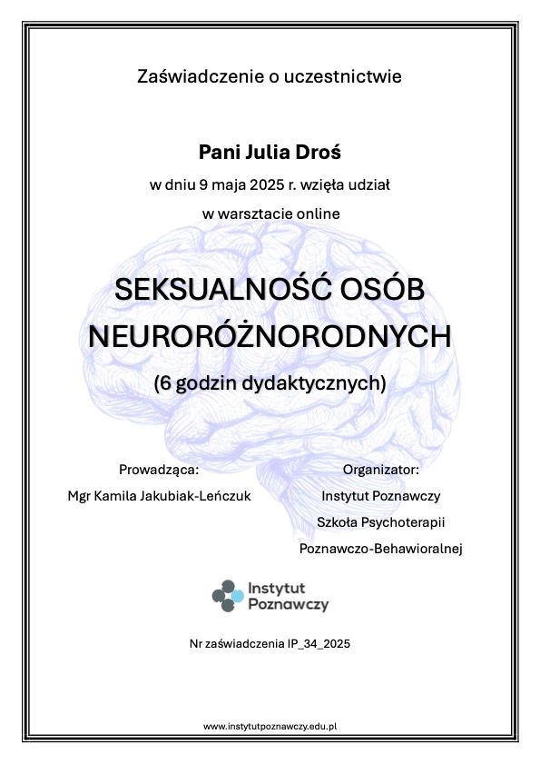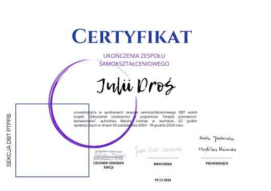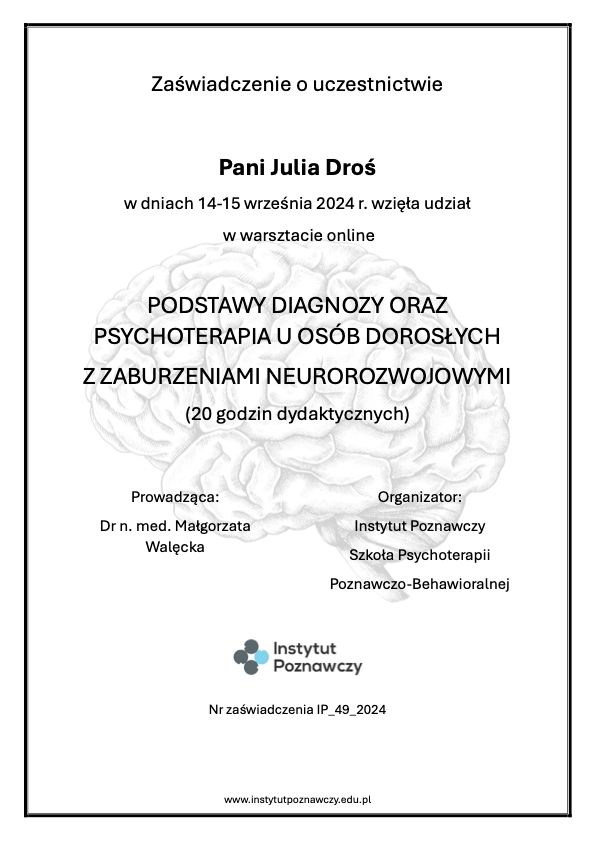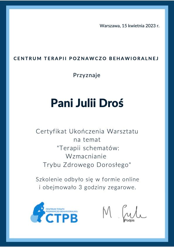 Jestem psycholożką oraz psychoterapeutką terapii poznawczo-behawioralnej w trakcie certyfikacji. Ukończyłam studia magisterskie na Uniwersytecie SWPS we Wrocławiu oraz 4-letnie szkolenie w nurcie poznawczo-behawioralnym w Instytucie Poznawczym w Krakowie. Obecnie ubiegam się o uzyskanie certyfikatu psychoterapeuty poznawczo-behawioralnego.