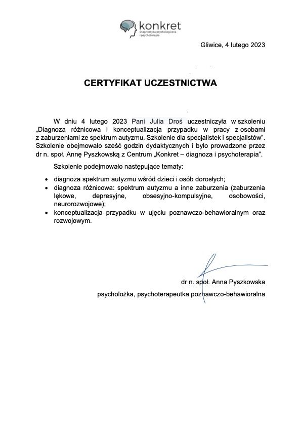 Pani Julia była ogromnym wsparciem w trudnym okresie mojego życia i pomogła mi uporać się z destrukcyjnymi nawykami. Możliwość odbywania wizyt online była dużym udogodnieniem, a jakość spotkań nie odbiegała od tych stacjonarnych i nie stanowiła żadnej bariery w komunikacji. Jestem ogromnie wdzięczna za otrzymane wsparcie i z pełnym przekonaniem polecam współpracę z Panią Julią.