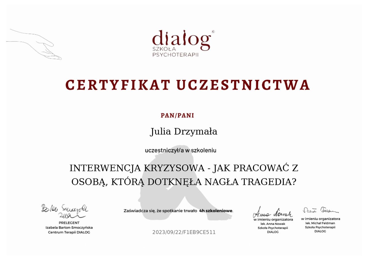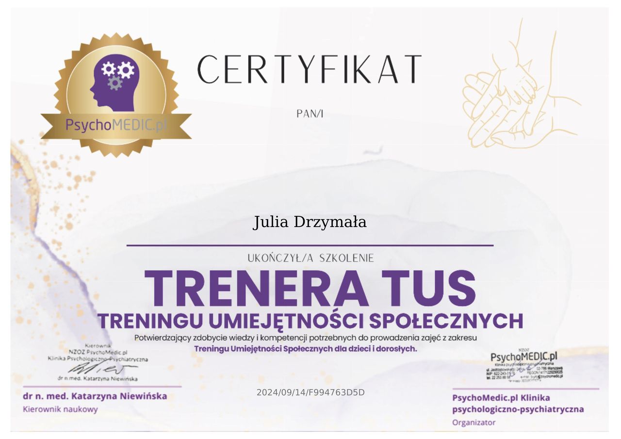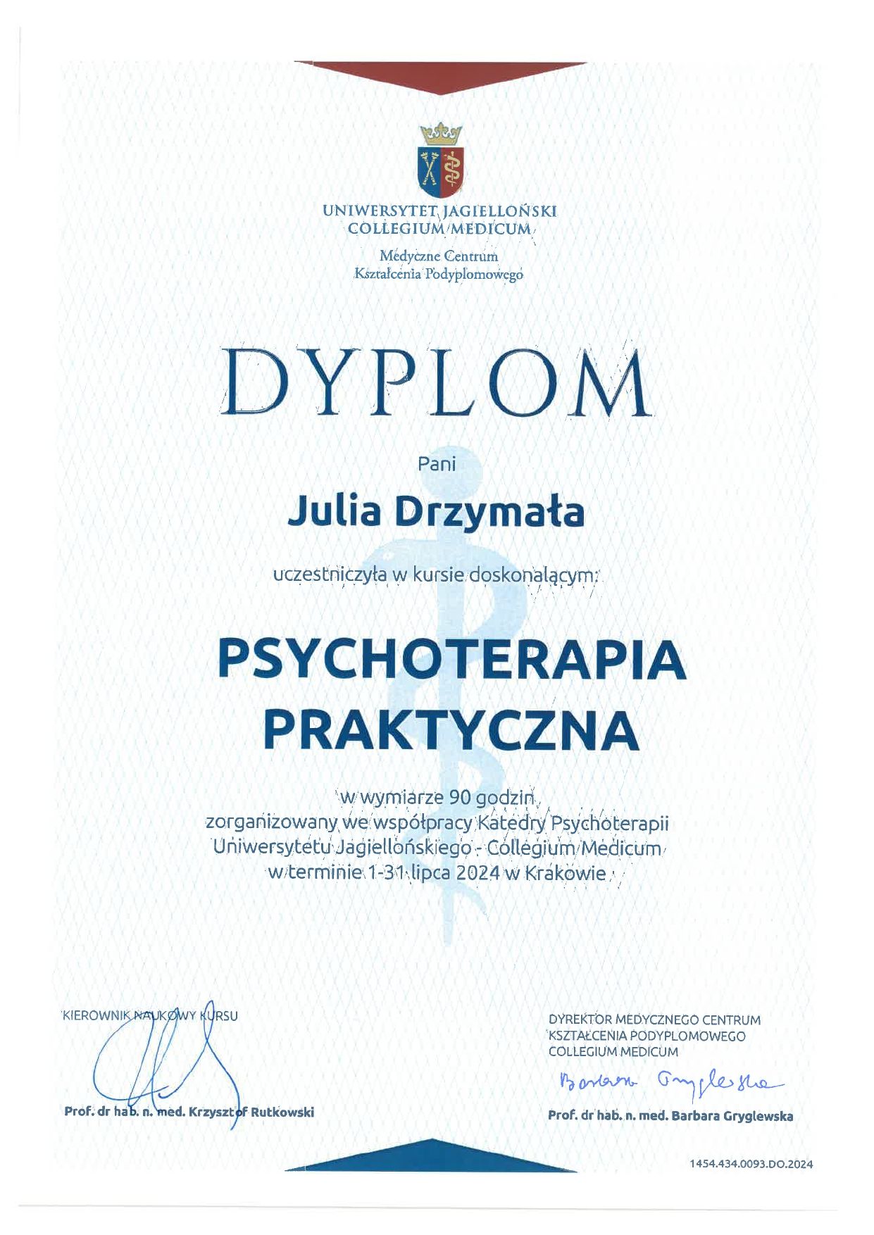 Ukończyłam kurs „Psychoterapia praktyczna” realizowany w formie stażu przy Uniwersytecie Jagiellońskim Collegium Medicum oraz zdobyłam certyfikat Trenerki Treningu Umiejętności Społecznych (TUS). Brałam udział w projektach badawczych dotyczących traumy wojennej, a także współtworzyłam materiały psychoedukacyjne, które miały na celu zwiększanie świadomości i dostępności wiedzy psychologicznej.