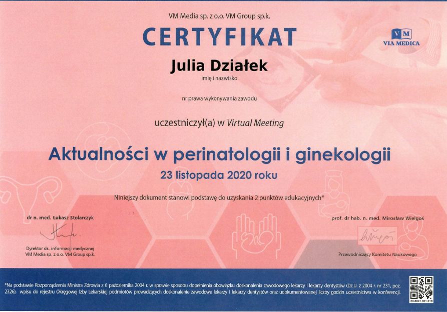 Zajmuję się kompleksową opieką ginekologiczną i położniczą – od profilaktyki, przez przygotowanie do ciąży, po wsparcie okołoporodowe. Udzielam również porad dotyczących zdrowia intymnego, wirusa HPV oraz jego profilaktyki i diagnostyki.