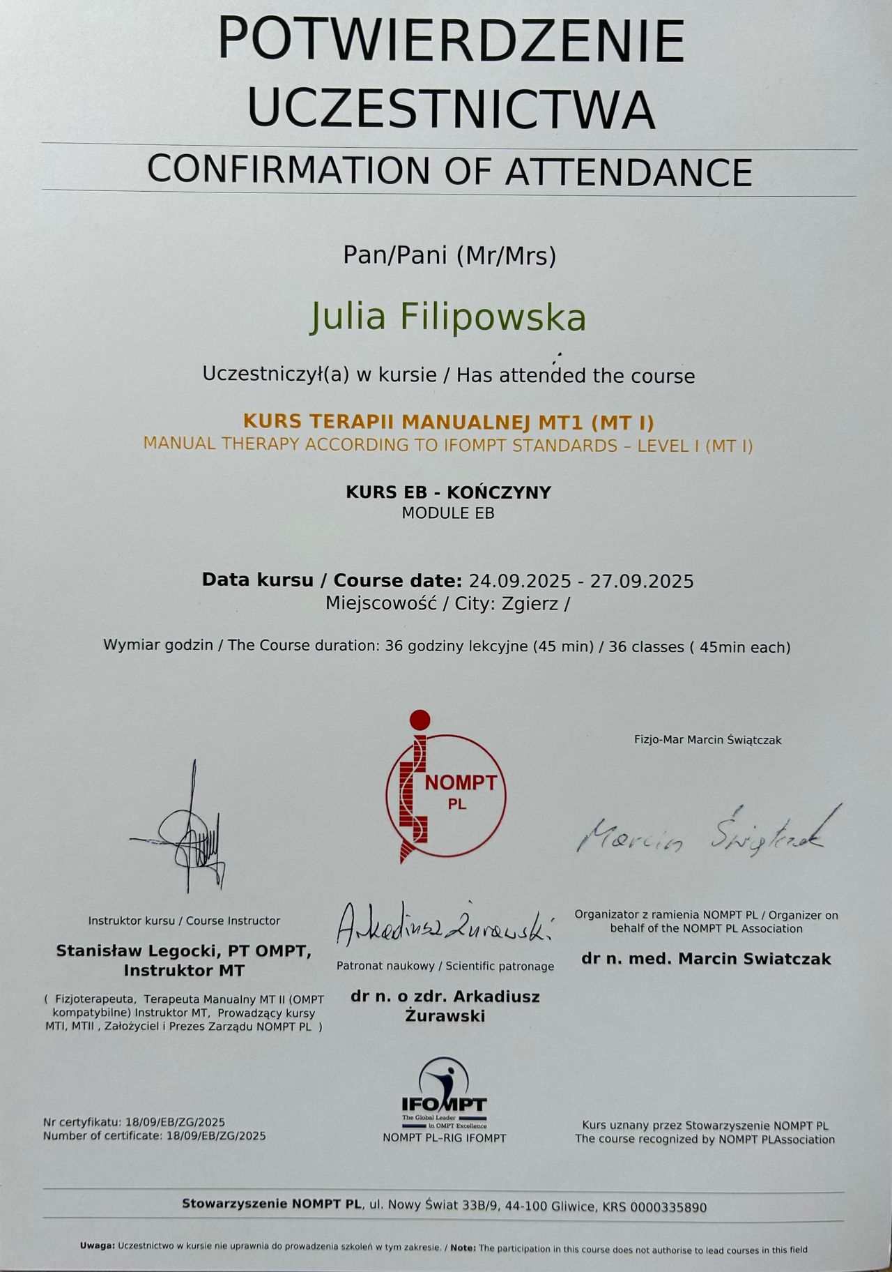 Pełen profesjonalizm, duża wiedza i dokładne wyjaśnienie, jak będzie przebiegać moja rehabilitacja. Już po pierwszej wizycie odczułem poprawę. Julia zdecydowanie jest specjalistką godną zaufania.