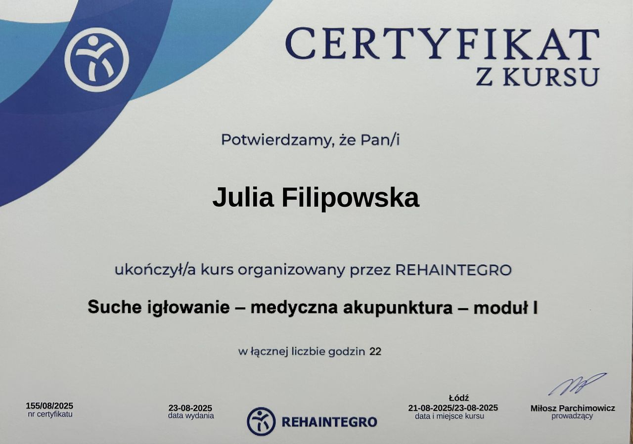 Julia jest niesamowicie profesjonalna, a przy tym ciepła i pozytywna. Ma ogromne wyczucie, potrafi słuchać i naprawdę pomaga — zarówno w pracy z ciałem, jak i przy akupunkturze. Widać, że kocha to, co robi, i jest w tym naprawdę świetna. Z całego serca polecam każdemu!