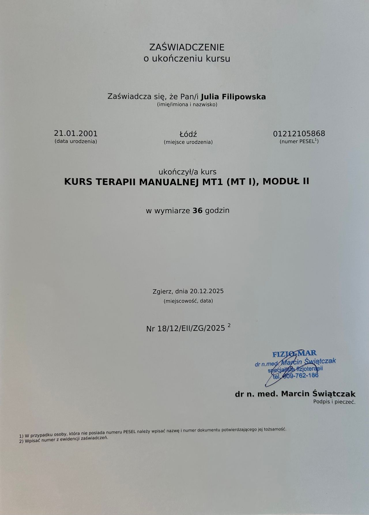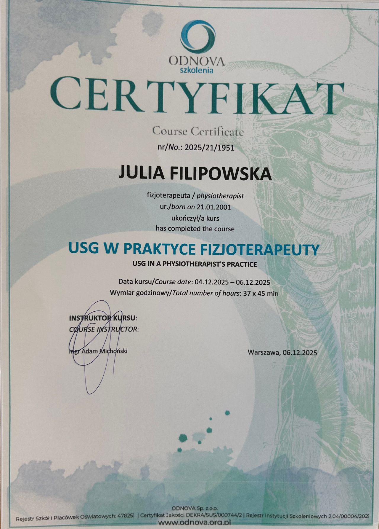 Ukończyłam kierunek fizjoterapii na Uniwersytecie Medycznym w Łodzi. Od zawsze jestem związana ze sportem – przez 5 lat trenowałam siatkówkę, a w wolnym czasie uprawiam również akrobatykę, pływanie, sporty wodne oraz badmintona. Dzięki temu doskonale rozumiem, jak istotny jest powrót do pełnej sprawności, by móc realizować swoje pasje i dążyć do wyznaczonych celów.