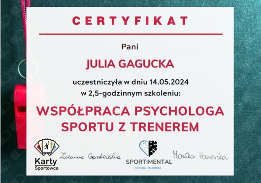 Dyplomowana w zakresie Technik i Obszarów Pracy Psychologa Sportu.