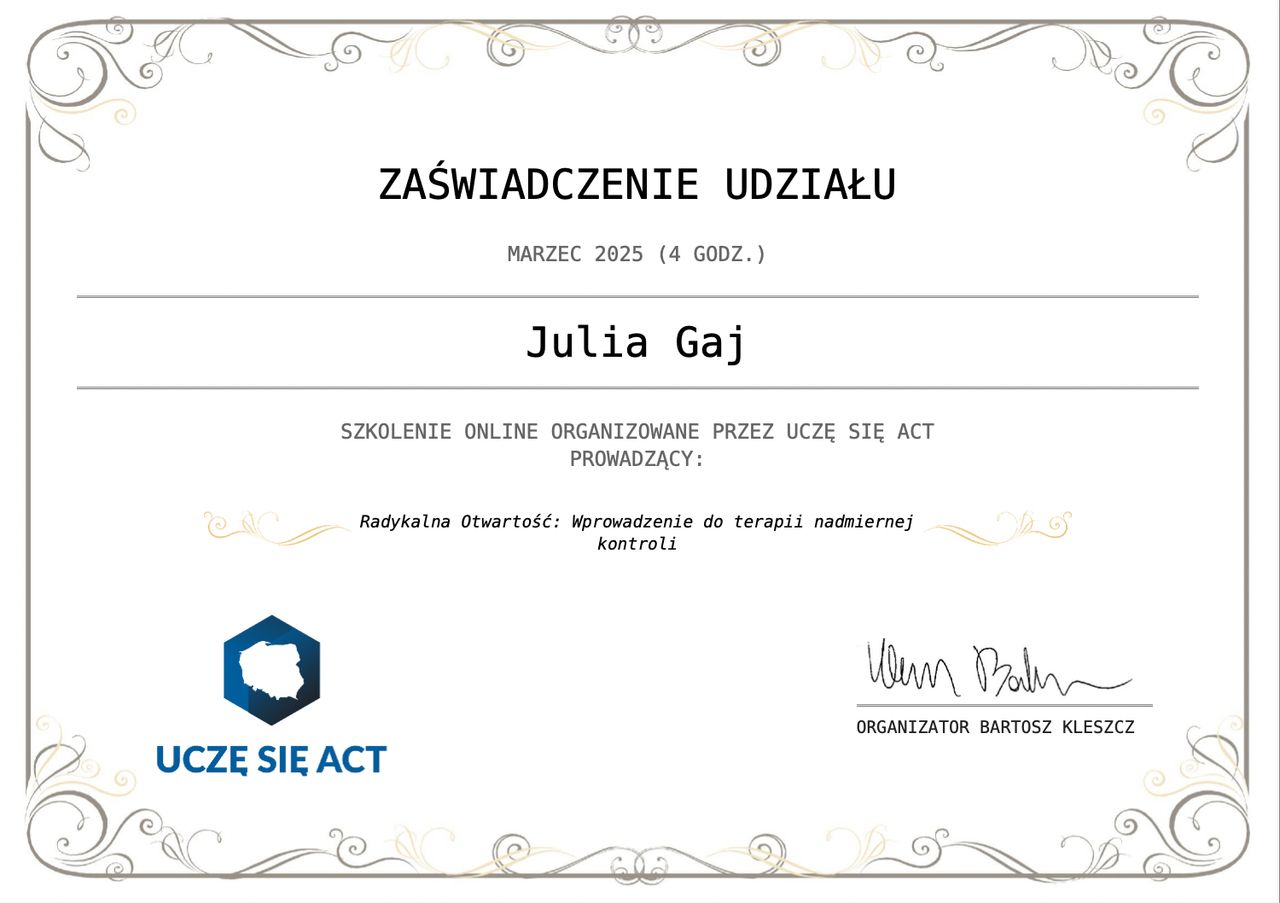 Nazywam się Julia Gaj i jestem dyplomowaną psycholożką. Ukończyłam pięcioletnie studia na Uniwersytecie SWPS w Poznaniu, ze specjalnością kliniczną. Stale pogłębiam swoją wiedzę, uczestnicząc w wielu kursach i szkoleniach, by móc oferować Pacjentom pomoc na najwyższym poziomie. W swojej pracy korzystam głównie z technik poznawczo-behawioralnych oraz ACT. Staram się czerpać ze wszystkich nurtów psychoterapeutycznych to, co według mnie jest najbardziej przydatne dla Pacjenta w danym momencie.