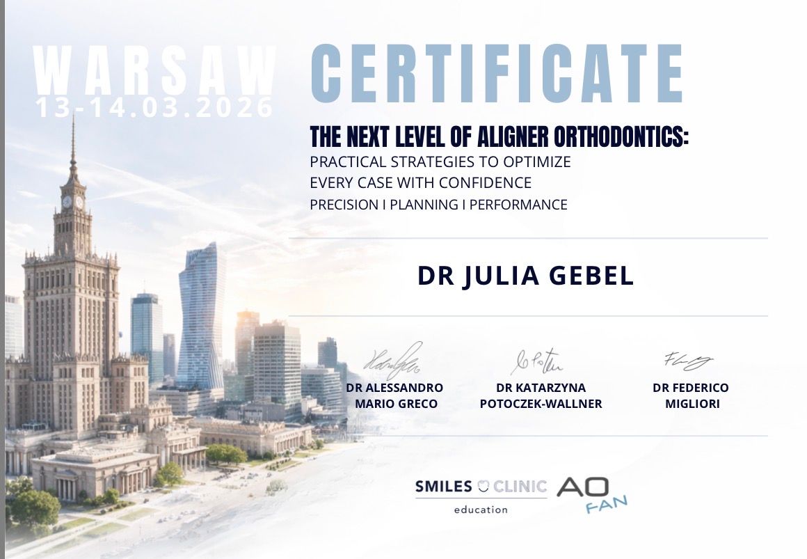 Jestem absolwentką Wydziału Lekarskiego, kierunku lekarsko-dentystycznego Gdańskiego Uniwersytetu Medycznego, w 2021 otrzymałam tytuł Specjalisty Stomatologii Zachowawczej z endodoncją. Jestem członkiem prestiżowych europejskich organizacji: European Society of Cosmetic Dentistry (ESCD) oraz Europejskiego Towarzystwa Ortodontycznego (EOS). Posiadam międzynarodową certyfikację w leczeniu ortodontycznym systemem Invisalign. Ukończyłam Curriculum Endodontyczne. Stale podnoszę swoje kwalifikacje uczestnicząc w międzynarodowych konferencjach naukowych (m.in. USA, Rzym, Ateny, Berlin, Petersburg, Niemcy, Hiszpania, Bucharest, Belgrad, Budapeszt, Austria) kursach z zakresu ortodoncji, protetyki, stomatologii odtwórczej oraz endodoncji. Specjalizuję się w stomatologii estetycznej, leczeniu ortodontycznym Invisalign, protetyce oraz w nowoczesnym leczeniu endodontycznym pod mikroskopem. W mojej pracy ogromny nacisk kładę na wysoką precyzję oraz estetykę wykonywanych zabiegów przeprowadzanych zgodnie z najnowszą wiedzą medyczną. Wszystkie procedury wykonuję przy użyciu mikroskopu lub lup zabiegowych. W mojej codziennej pracy wykorzystuję najnowocześniejsze narzędzia diagnostyczne, takie jak tomografia komputerowa.