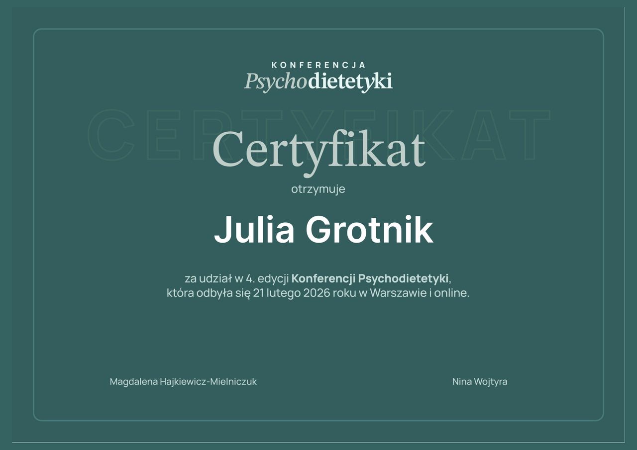 Jaki jest zakres porad oferowanych przez Julia Grotnik?Julia Grotnik to dietetyk. Na podstawie swojego doświadczenia i wykształcenia Julia Grotnik oferuje usługi takie jak: Konsultacja dietetyczna, Konsultacja dietetyczna - pierwsza wizyta 1 osoba, konsultacja rodzinna.