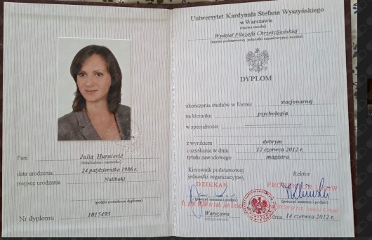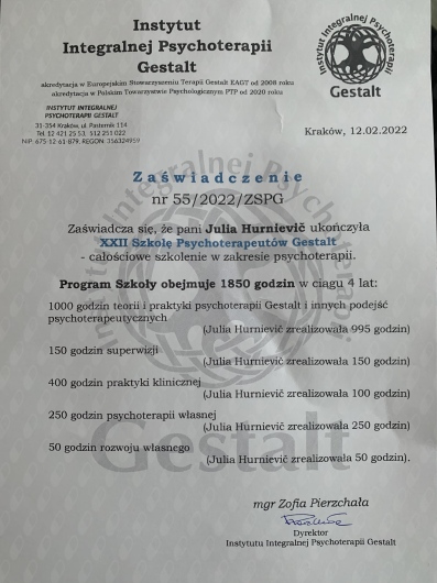 Меня зовут Юля, я — психолог и психотерапевт в подходе Гештальт, сейчас нахожусь на этапе сертификации. Свой профессиональный путь я начала с изучения психологии в Университете кардинала Стефана Вышинского в Варшаве, а затем прошла четырёхлетнее обучение в Институте интегральной гештальт-терапии в Кракове.