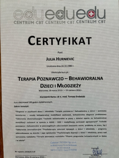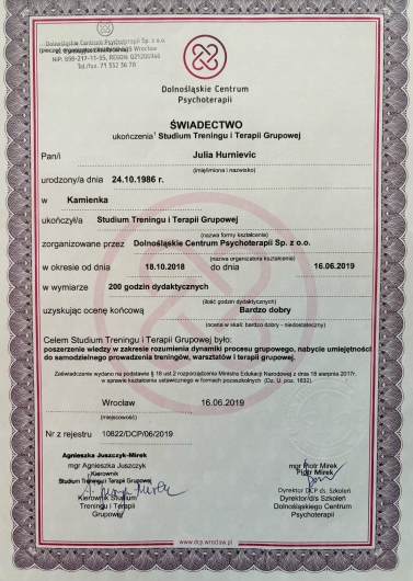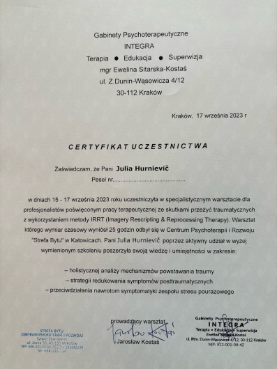 Stale rozwijam swoje kompetencje, uczestnicząc w konferencjach i szkoleniach, a swoją pracę poddaję regularnej superwizji, by zapewnić moim pacjentom pomoc na najwyższym poziomie w atmosferze bezpieczeństwa, szacunku i autentycznego kontaktu.