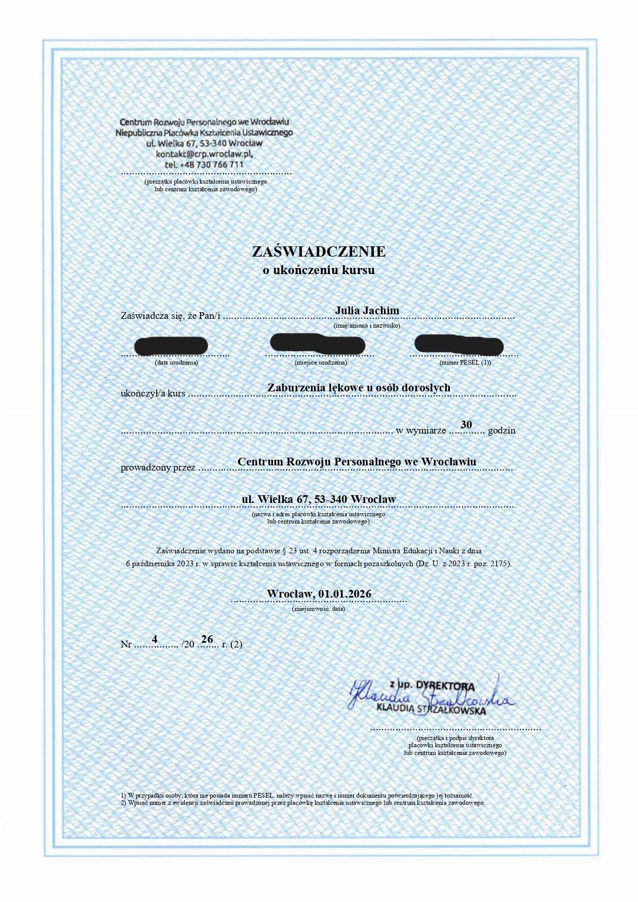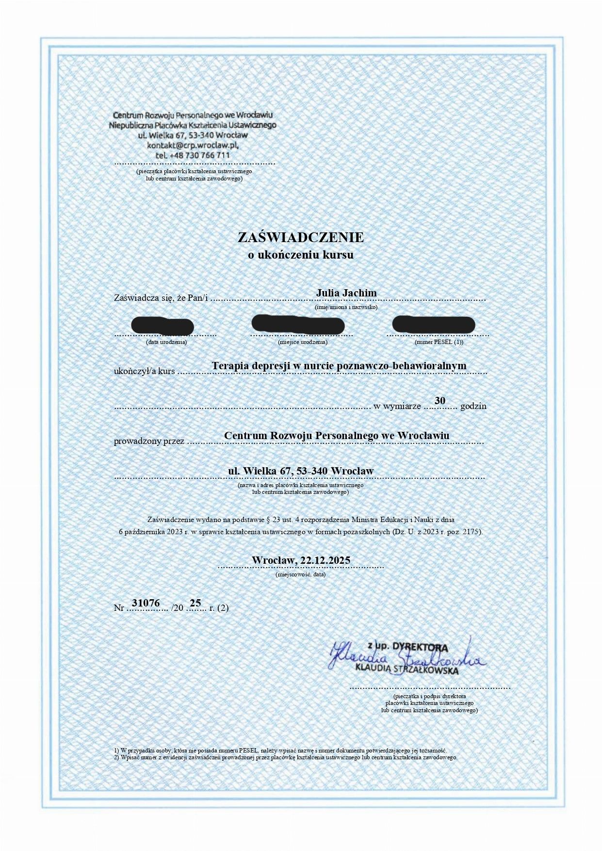 Ukończyłam kursy z zakresu psychotraumatologii, terapii depresji w nurcie poznawczo-behawioralnym oraz pracy z zaburzeniami lękowymi u osób dorosłych. Aktualnie uczestniczę w szkoleniu z dialogu motywującego oraz innych kursach i szkoleniach