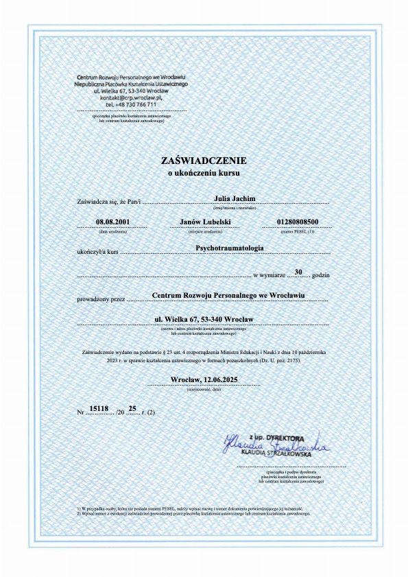 Ukończyłam kurs z psychotraumatologii, aktualnie uczestniczę w szkoleniu z dialogu motywującego oraz innych kursach i szkoleniach