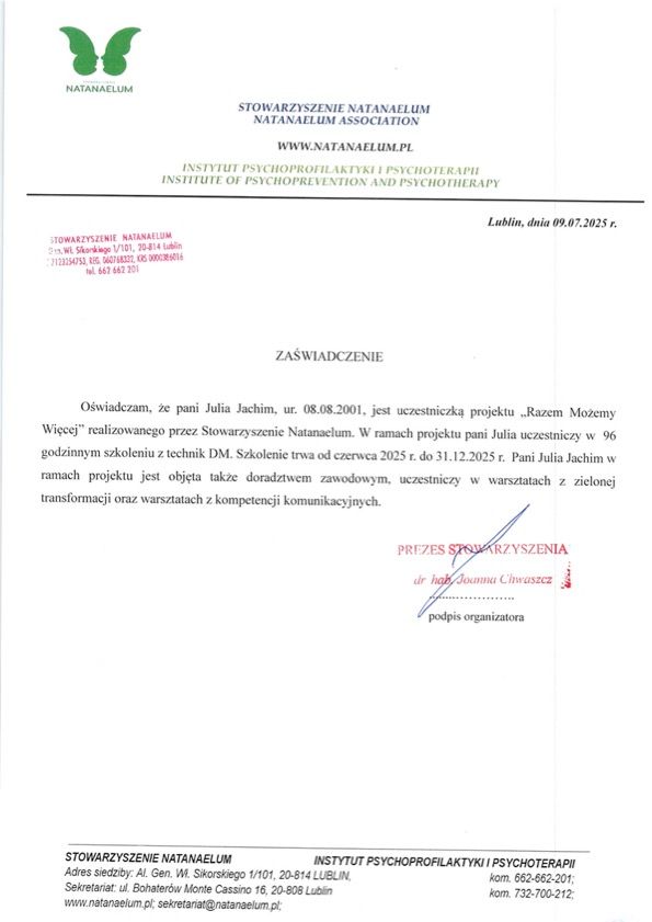 Stowarzyszeniem Natanaelum – Centrum Profilaktyki i Psychoterapii,