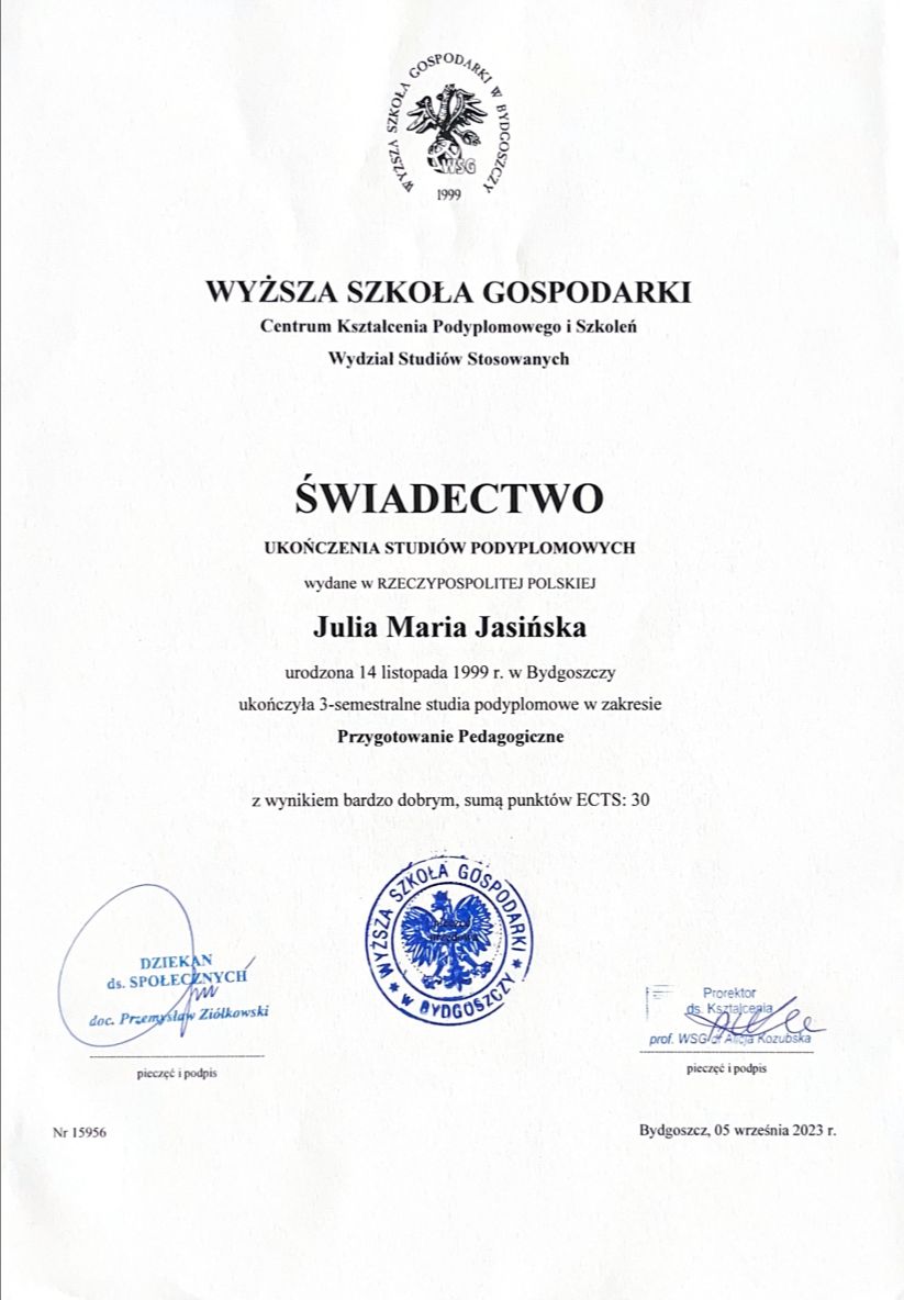 W jakich językach konsultuje Julia Jasińska?Języki, których używa Julia Jasińska to angielski, polski.